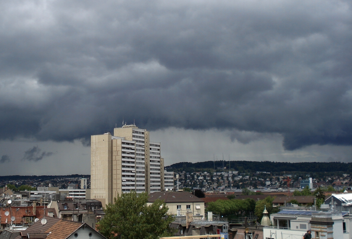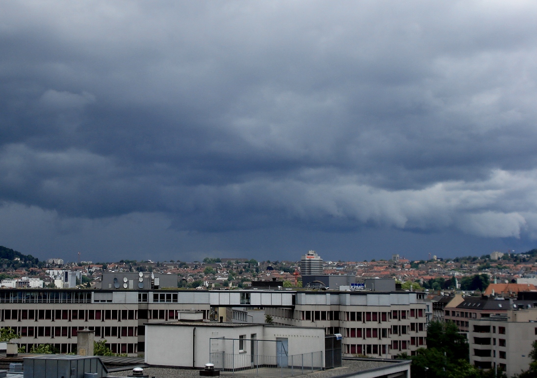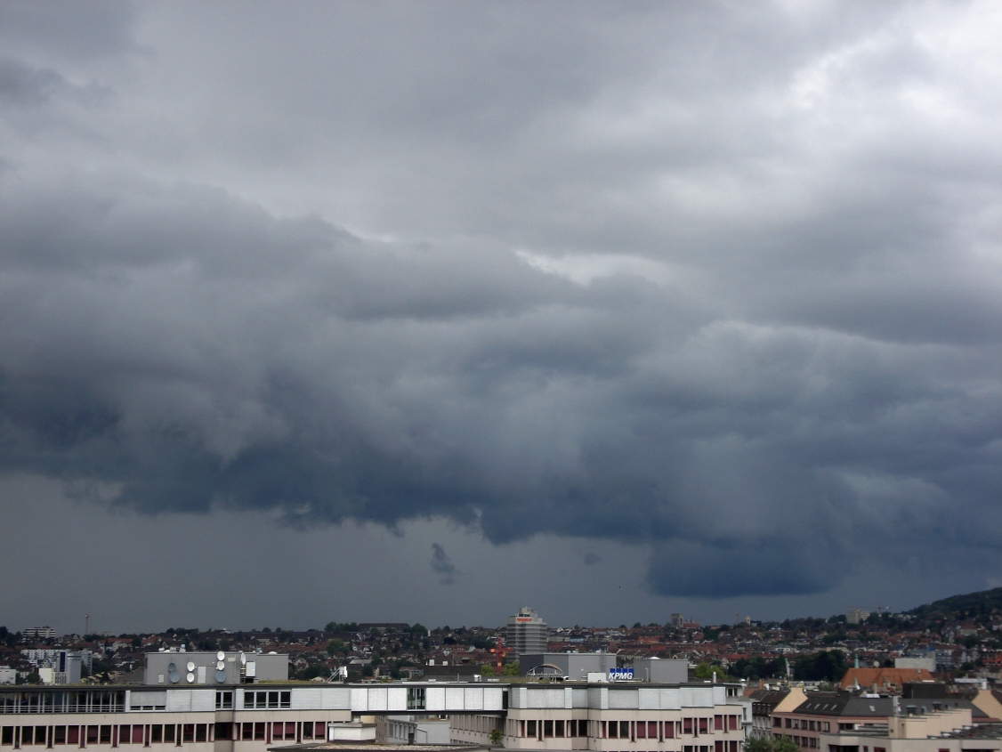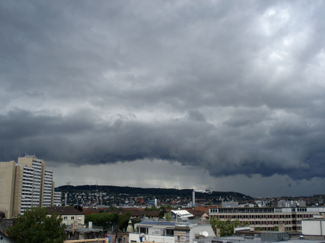 Soeben hat sich in Zürich der Himmel sehr dramatisch gezeigt! Tolle Fraktus konnte man beobachten. So etwas wie eine Wolkenabsenkung, war ebenfalls zu beobachten. Ich wartete eigentlich nur noch auf den 1. Blitz. Leider habe ich bis jetzt keinen bemerkt... also nur ein "fast Gewitter"
