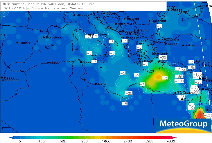 Zuerst fand ich die Prognose mal völlig unwahrscheinlich und sah mir mal den 12z-lauf für den 17.01.10 unden 15z-Lauf an. Da scheinen sich die Gewitter auf den Raum Kreta zu beschränken und die Tornados / Wasserhosen (durch die optimalen 300er- und Scheerungsverhältnisse in diesem Gebiet) östlich der Insel abzuspielen.