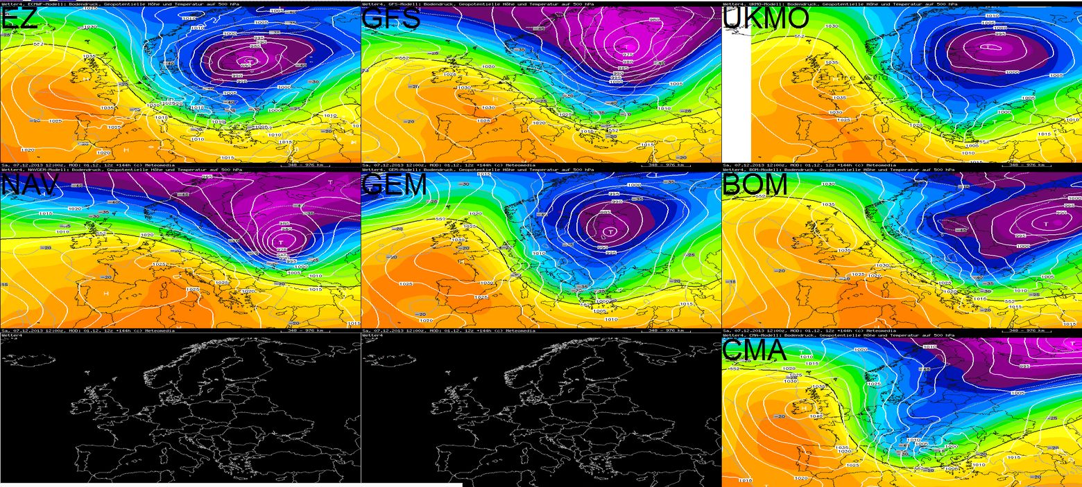 Hier die slp/500hPa Karten für Sa (7.12.)12z der grössten globalen Wettermodelle: