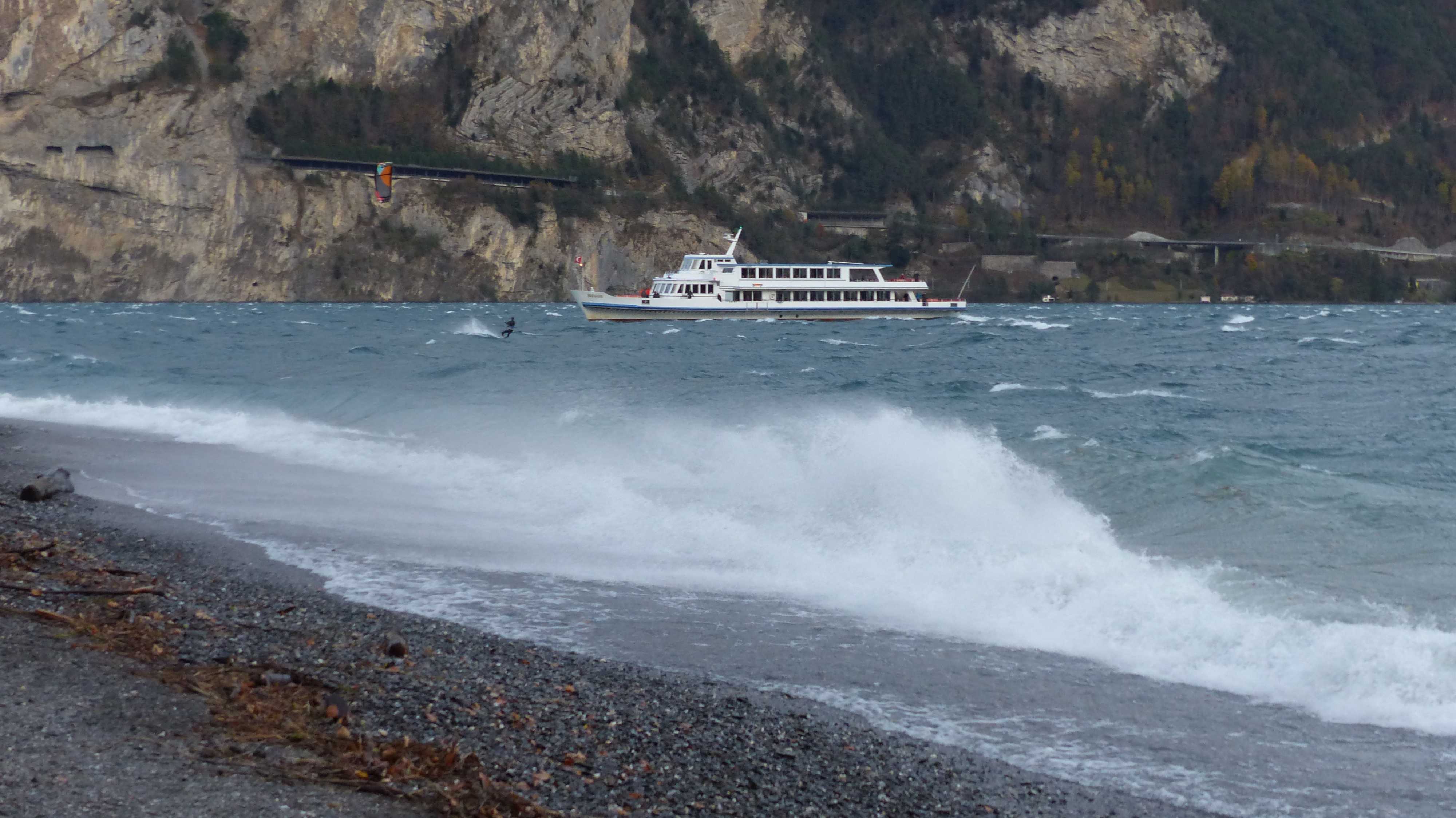 In Isleten eine Kombination aus Brandung im Vordergrund und einem Kite-Surfer und einem Verkehrschiff der Schifffahrtsgesellschaft Vierwaldstättersee.