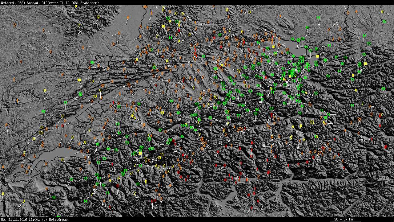 Wo hat's Föhn? .... zeigen nicht nur Windpfeile und Böen, sondern wo Taupunktsdifferenzen >10°