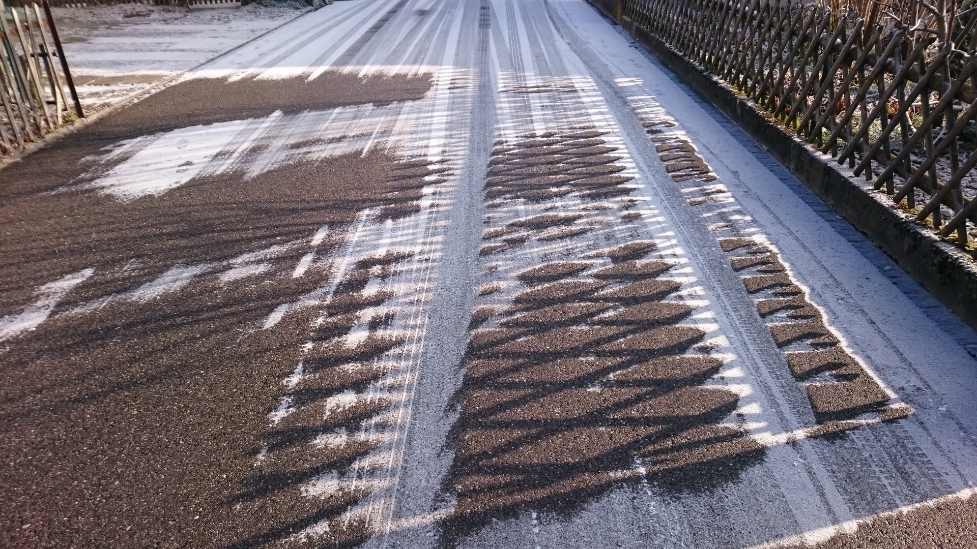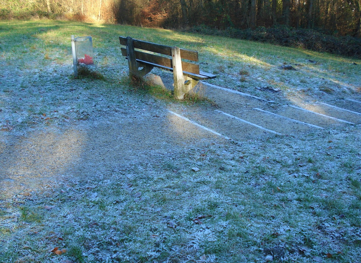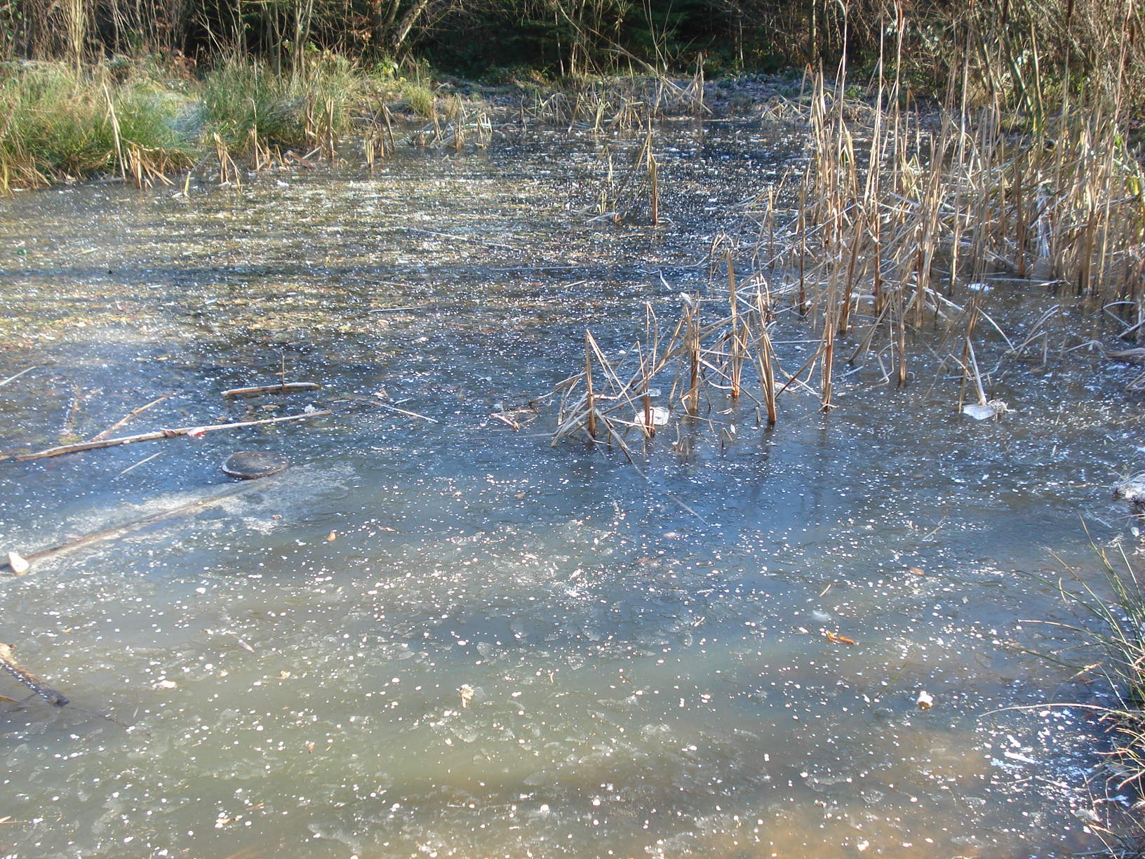 Der See ist seit dem Morgen des 29. November wieder zugefroren. Das war er bereits vom 8. bis zum 20. November, bevor der Föhn dem Eis den Garaus gemacht hat. Man sieht sehr schön, dass die Sonne nur noch den in Blickrichtung rechten hinteren Teil des Kaltluftsees erreicht und den Reif auch dort nur noch an den günstig exponierten Lagen wegzubraten vermag. Die höheren und insbesondere die sonnenexponierten Lagen sind reiffrei. Schattseitig gibt es Ausnahmen, z.B. links oberhalb der Bildmitte: dort gibts eine flache Senke vor der Bollenwees, die ebenfalls ziemlich verreift ist. Insgesamt ist's ein Zusammenspiel aus Exposition und Geländeform.