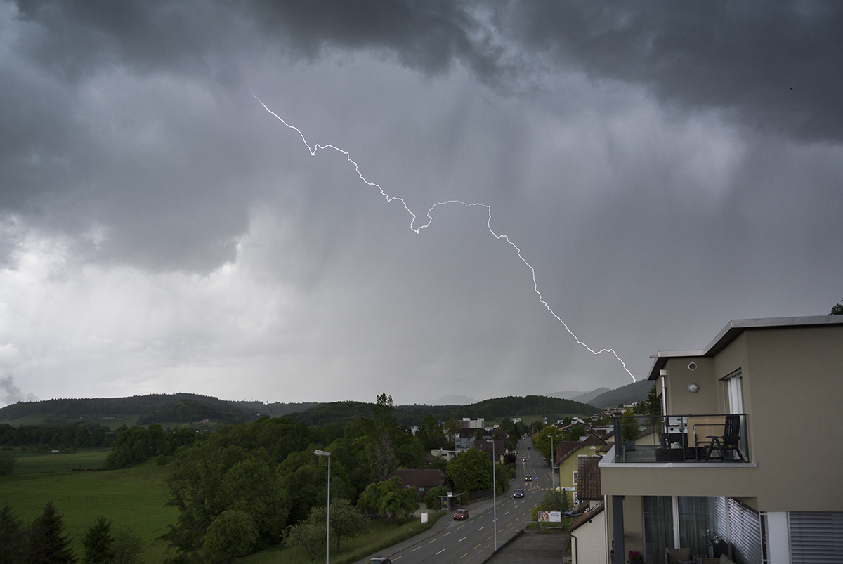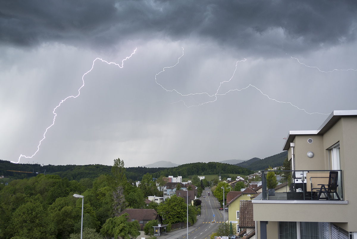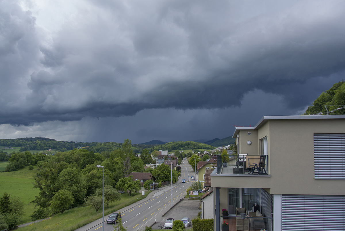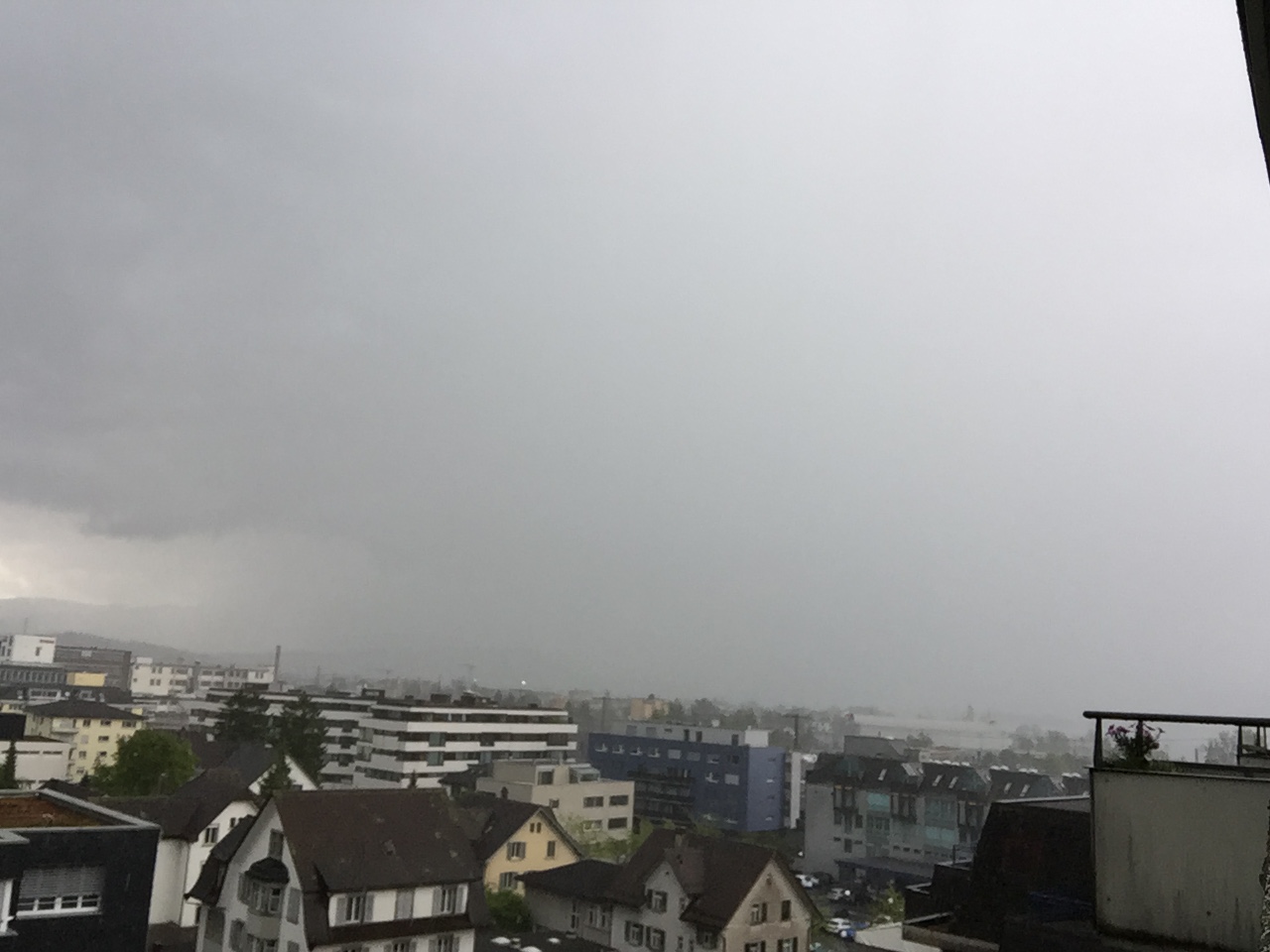 Es begann ein sehr grosstropfiger Starkregen, der vom Wind schräg in den Balkon regnete. Als ich ziemlich nass war, dokumentierte ich aus dem Trockenen weiter. Es regnete bestimmt 10 min lang in gelber Intensität.