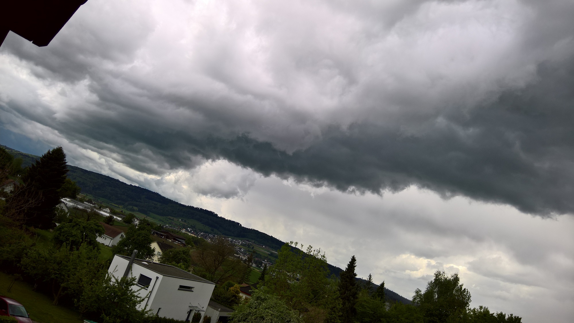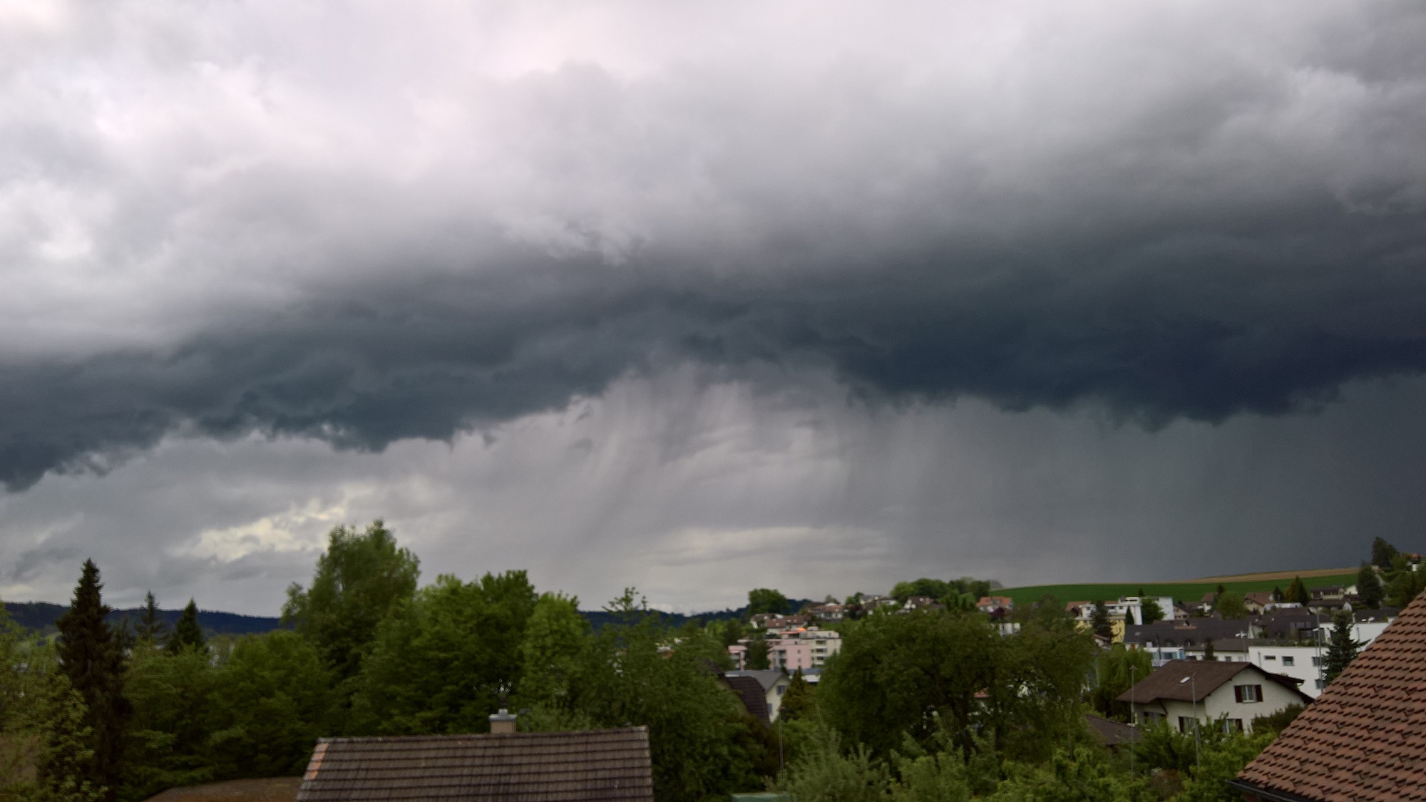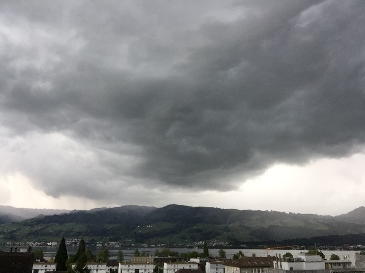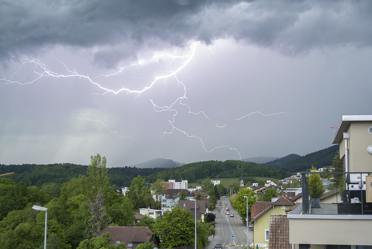 Es begann ein sehr grosstropfiger Starkregen, der vom Wind schräg in den Balkon regnete. Als ich ziemlich nass war, dokumentierte ich aus dem Trockenen weiter. Es regnete bestimmt 10 min lang in gelber Intensität.