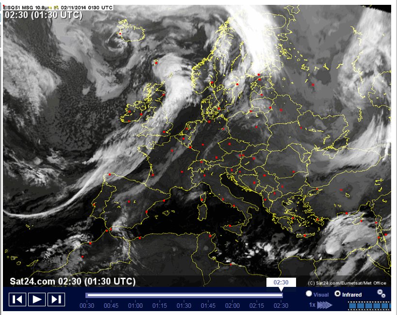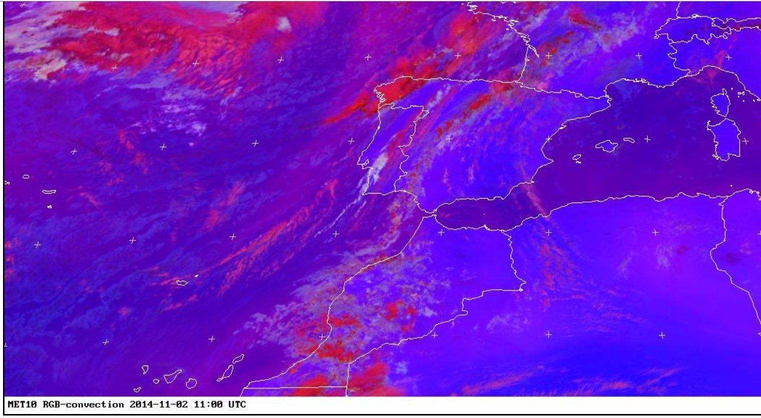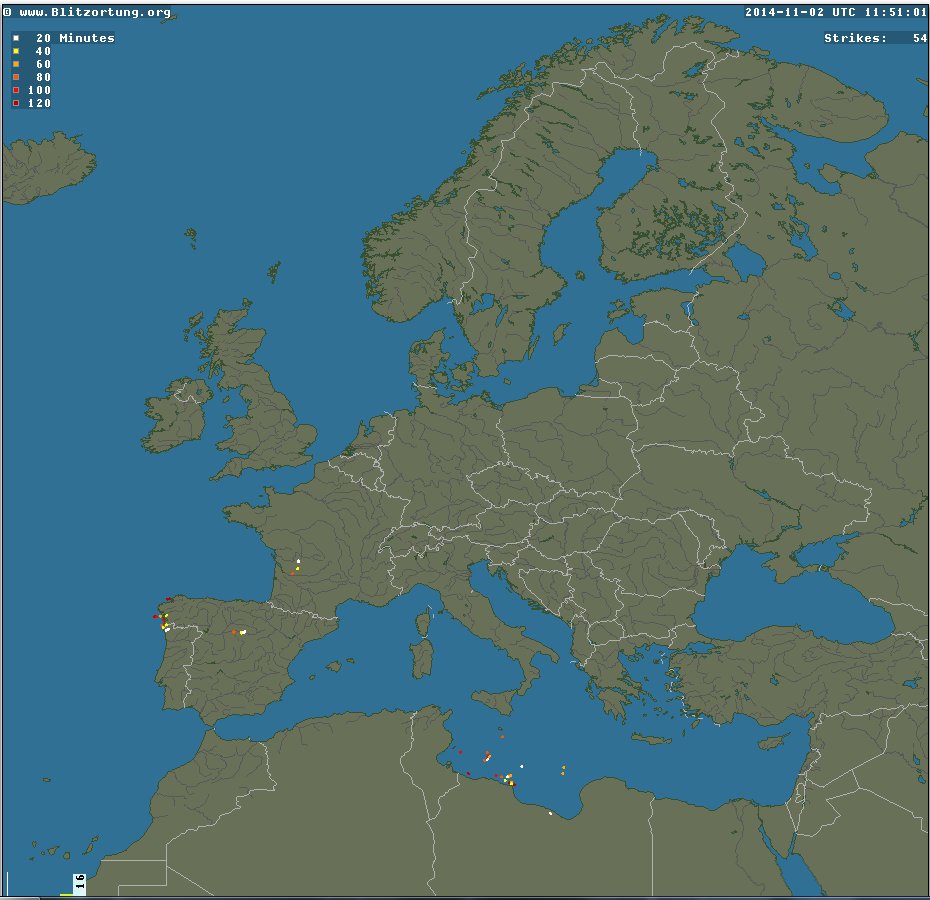 Am Sonntag, 02.11.2014, baut sich das Russlandhoch - wie oft in den letzten Jahren - noch aus (1030 hPa) und bildet ein massives Bollwerk. So wird der sich bildende Trog im Norden der iberischen Halbinsel geblockt und zwischen Azoren- und Russlandhoch eingeklemmt.