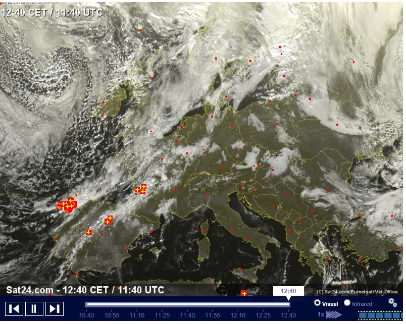 B zu einem Temperaturrückgang über Nord- und Zentralspanien (0° Grad Celsius), wobei die Pyrenäen ziemlich Schnee abbekommen und die noch belaubten Bäume Schaden nehmen könnten.