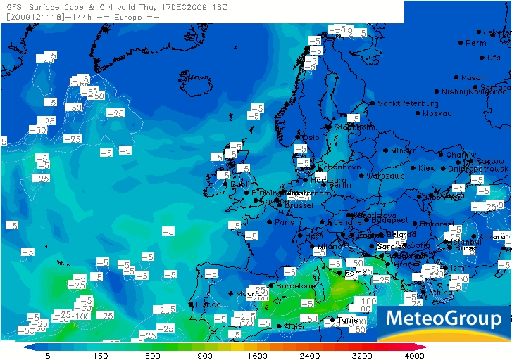 Um 18z (17.12.09) rechne ich östlich von Sardinien und an der Küste von Rom, bis hinunter nach Kalabrien mit zum Teil heftigen Gewittern. Die Taupunkte klettern bis auf 12°-14° Grad, odentliche CAPEs von über 1000-1200 J/kg und tiefe CIN-Werte versprechen schon mal ziemlich Potenzial. Die rel. hohe Temperatur des Mittelmeeres und beachtliche Vorticityadvections-Werte dürften als weitere Faktoren durchaus einen entscheidenden Einfluss haben.