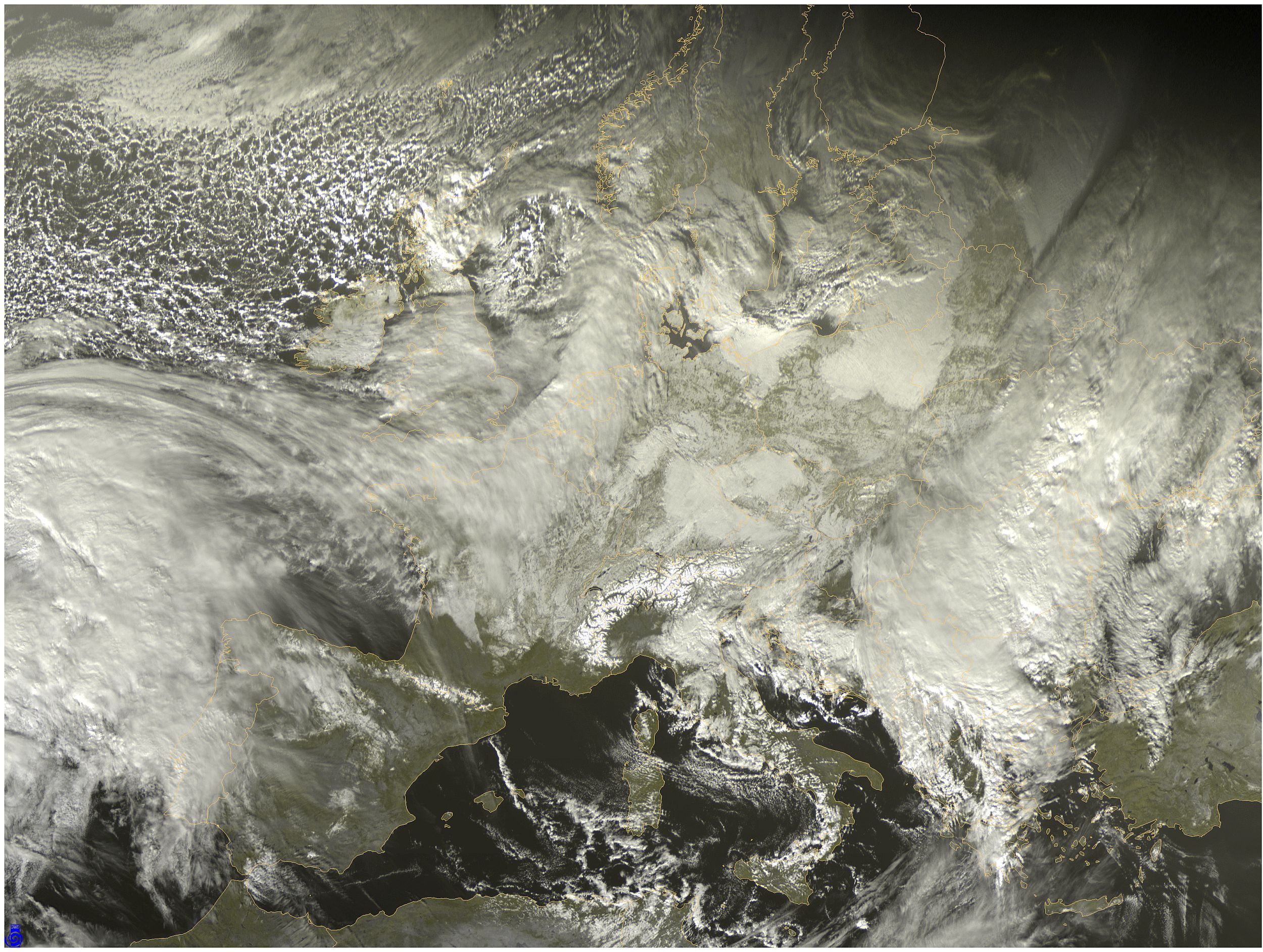 Aktuell befinden sich weite Teile Europas unter einer dicken Schneedecke. Vom All aus betrachtet sieht das sehr schön aus (VIS-Compsit 13:30 MEZ):