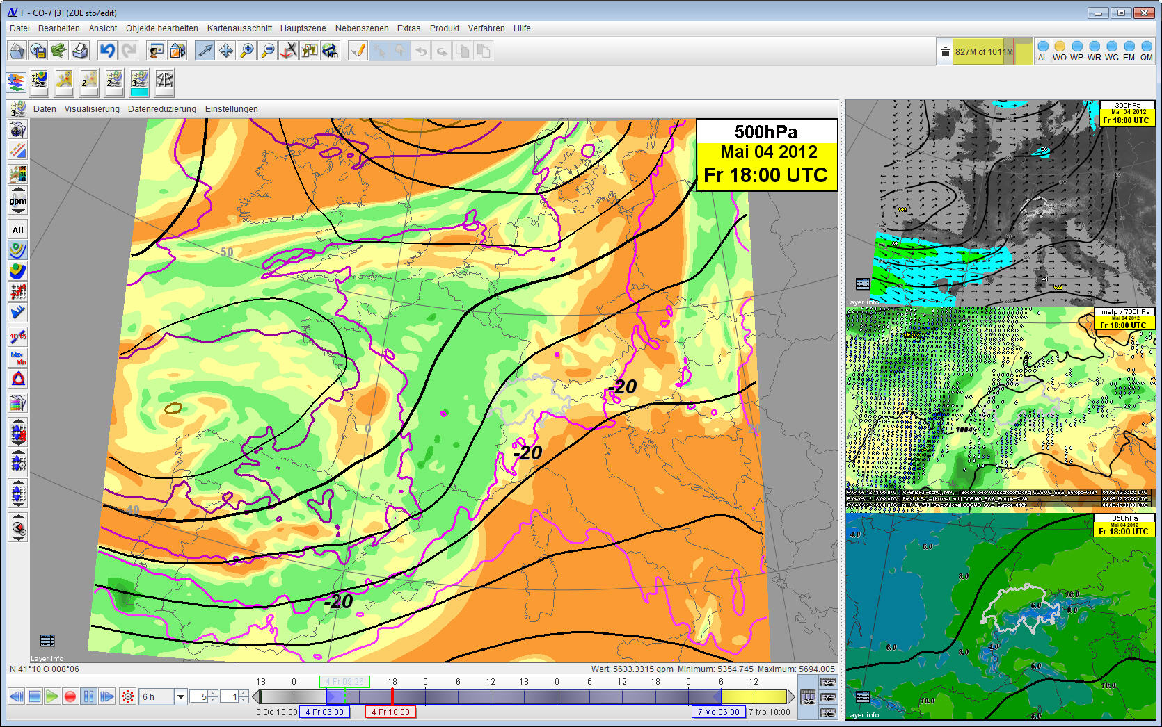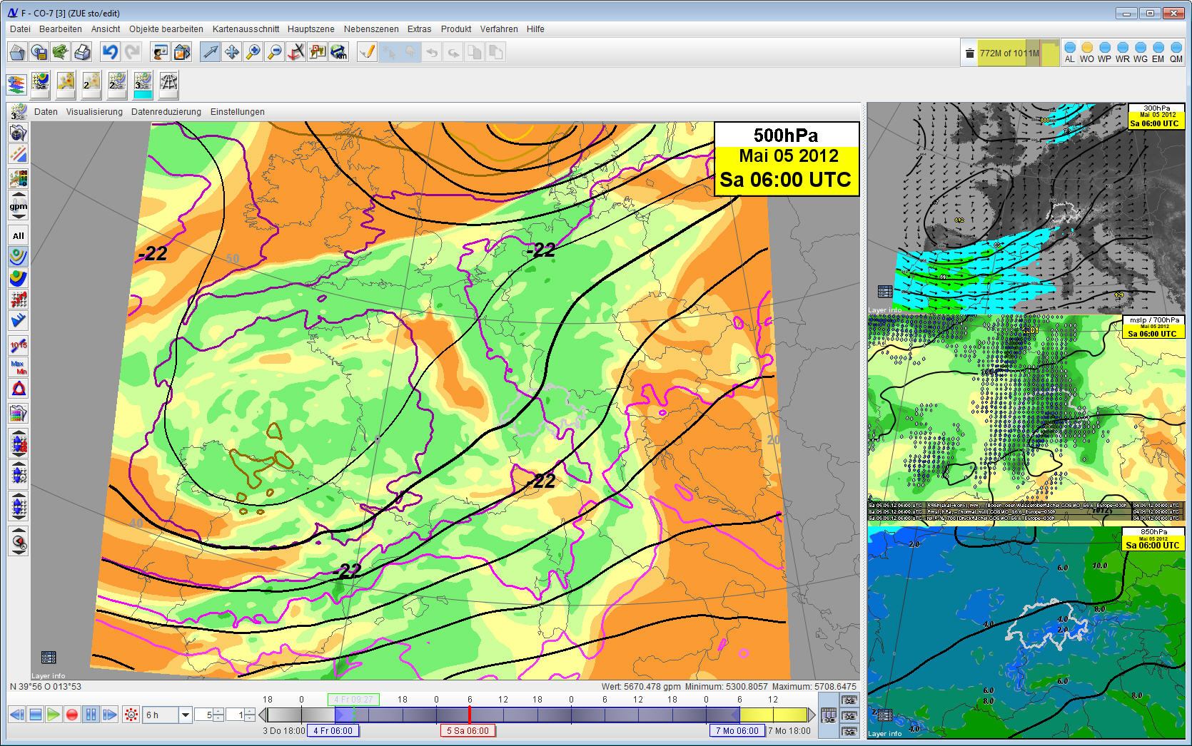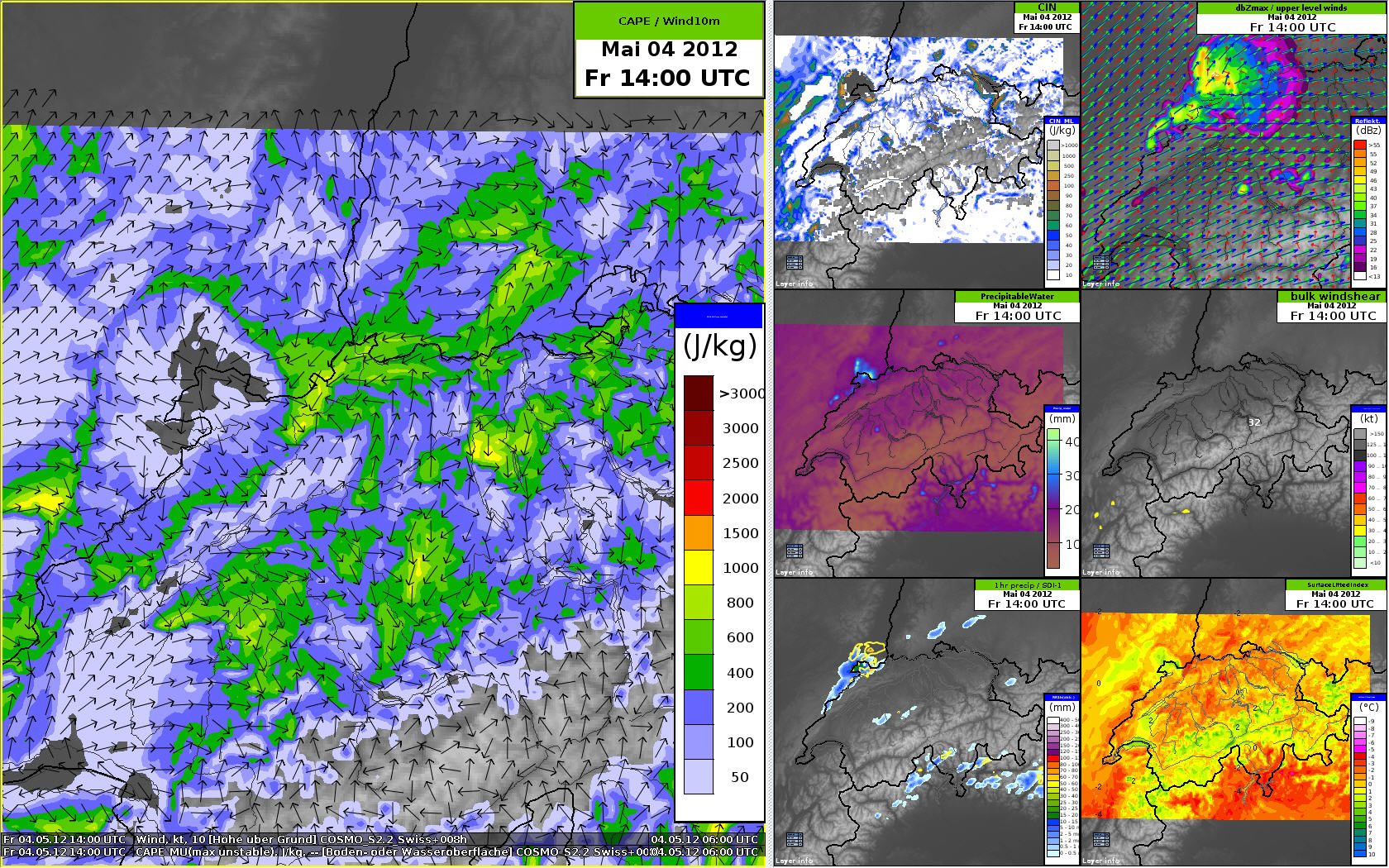 Von oben nach unten: COSMO-7 synoptische Übersicht (grosses Teilfenster 500hPa Z/T/RH), COSMO-2 Konvektionsparameter