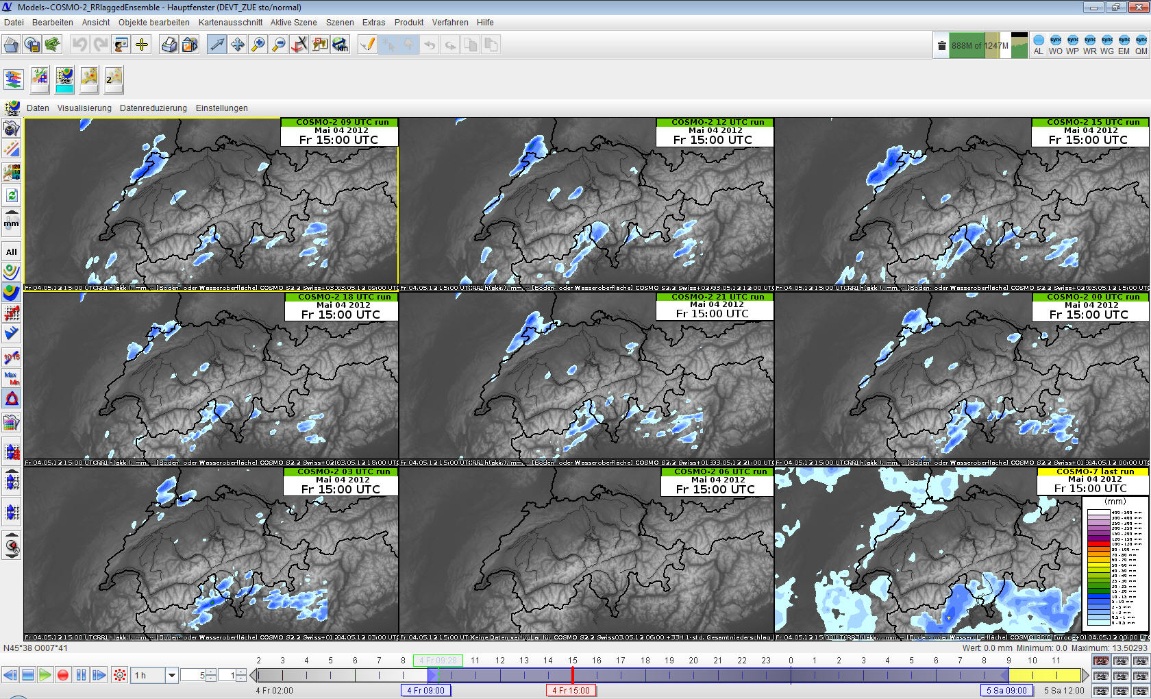 ein lagged ensemble 1h-precipitation der letzten 8 COSMO-2 Läufe sowie 3h-precipitation des letzten COSMO-7 Laufs für 15 UTC.