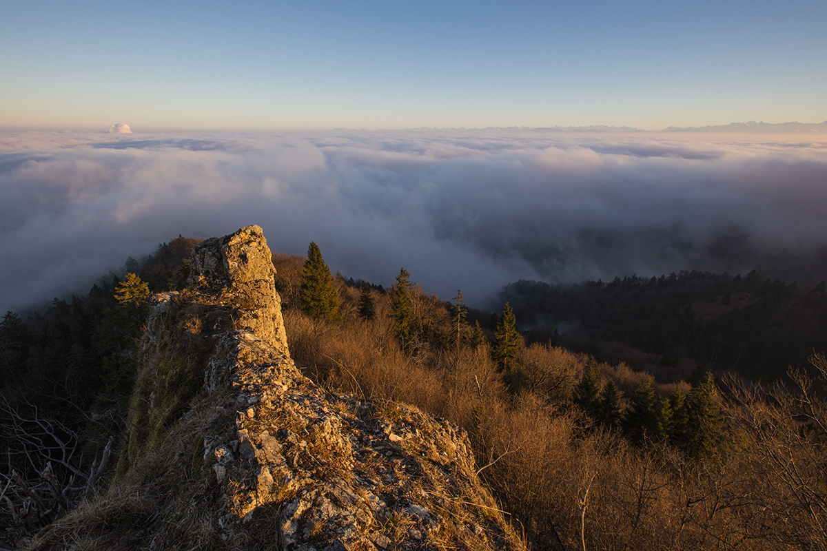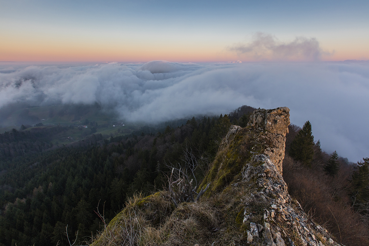 Das war gestern ein knappes Spiel. Ich war noch zuversichtlich, ein paar Sonnenuntergangsfotos über dem Nebel machen zu können. Gemäss Webcam auf der Wasserflue bei Aarau sollte dies auch kein Problem sein. Wo ich mich dann auf den Weg machte, war der Nebel schon weiter oben. Auf der Belchenflue (1099m ü. M.) hat es dann gerade so gereicht. Durch den starken Wind war es jedoch derart garstig und kalt, dass ich nach einer halben Stunde wieder abgehauen bin.
