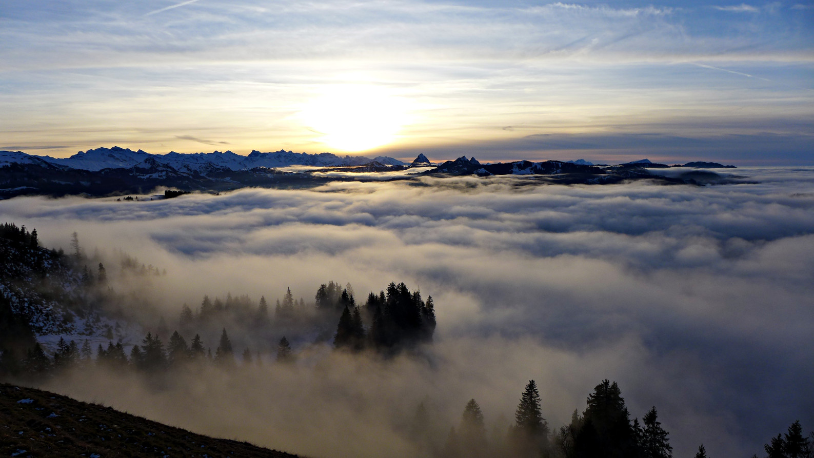 Ab 1:47 gibt es schöne Aufnahmen vom 30. Dezember. Mein Standort war der Walchwilerberg, knapp oberhalb der Nebelgrenze. Ich stand mitten in der Brandung. Das ganze wurde von der Abendsonne schön beleuchtet. Das Nebelmeer hatte eine ca.50m hohe flache Dünung. Bei dem flachen Beobachtungswinkel wirkt das recht beeindruckend.