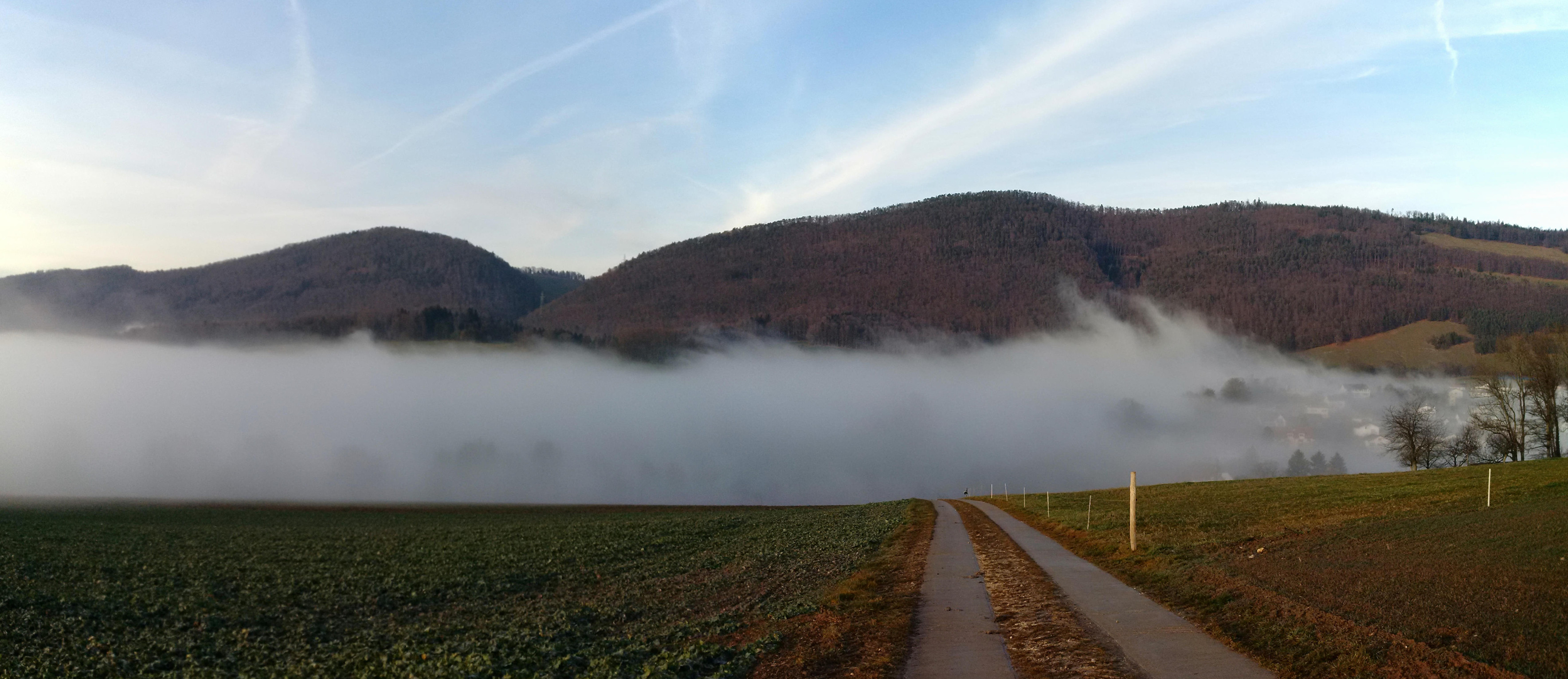 Blick richtung Norden auf Montsevelier. Der Nebel zieht gerade nach Delémont ab.
