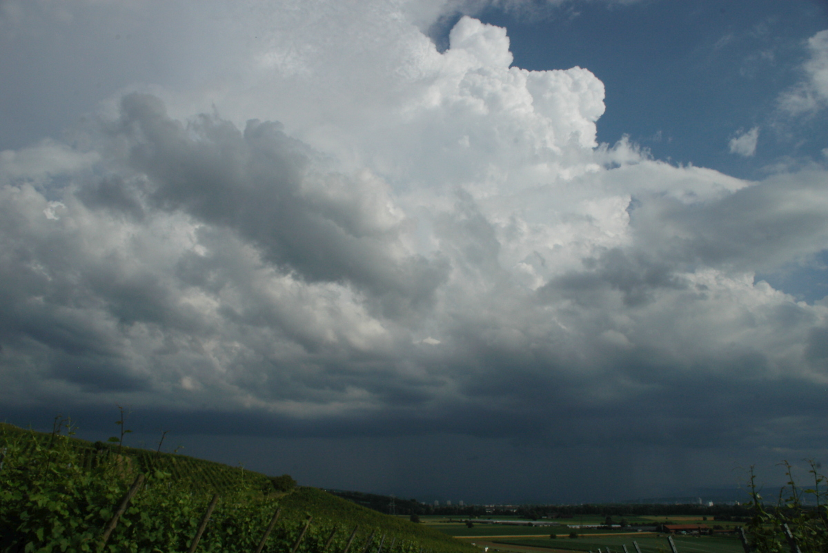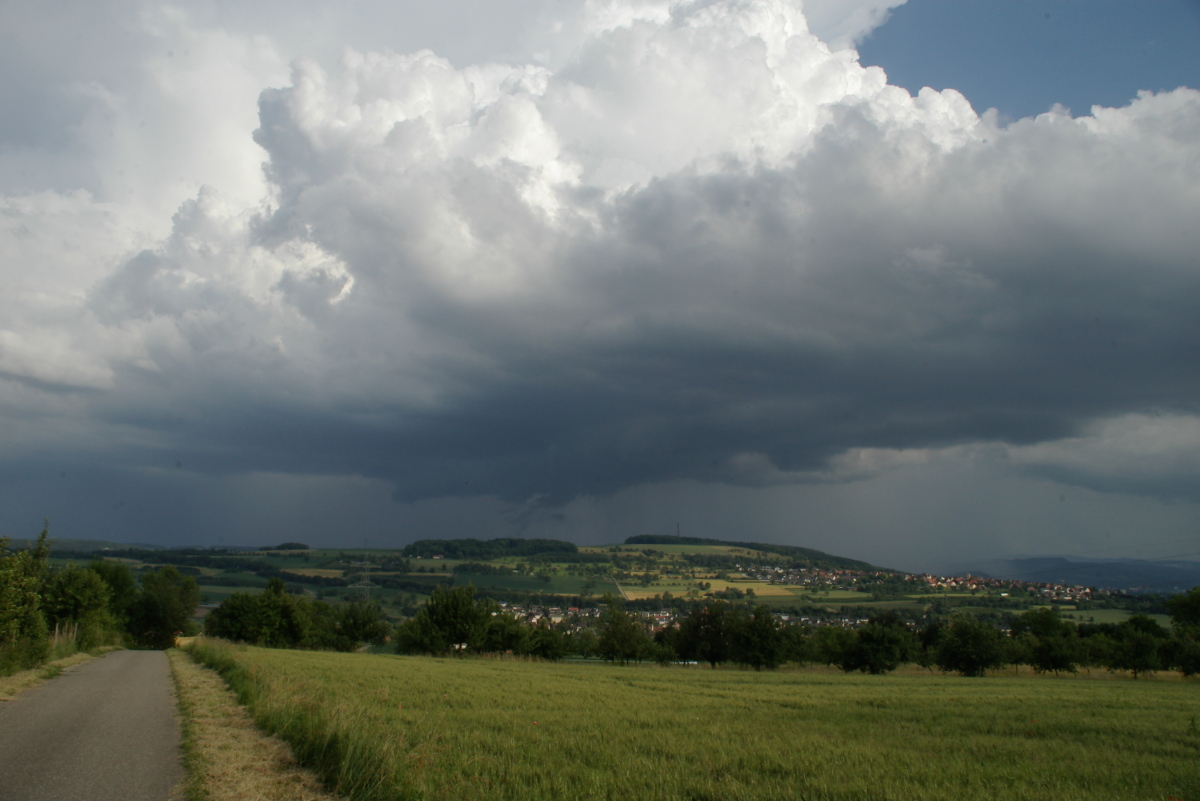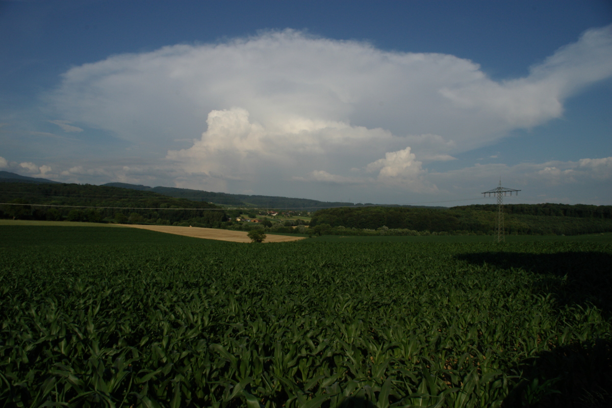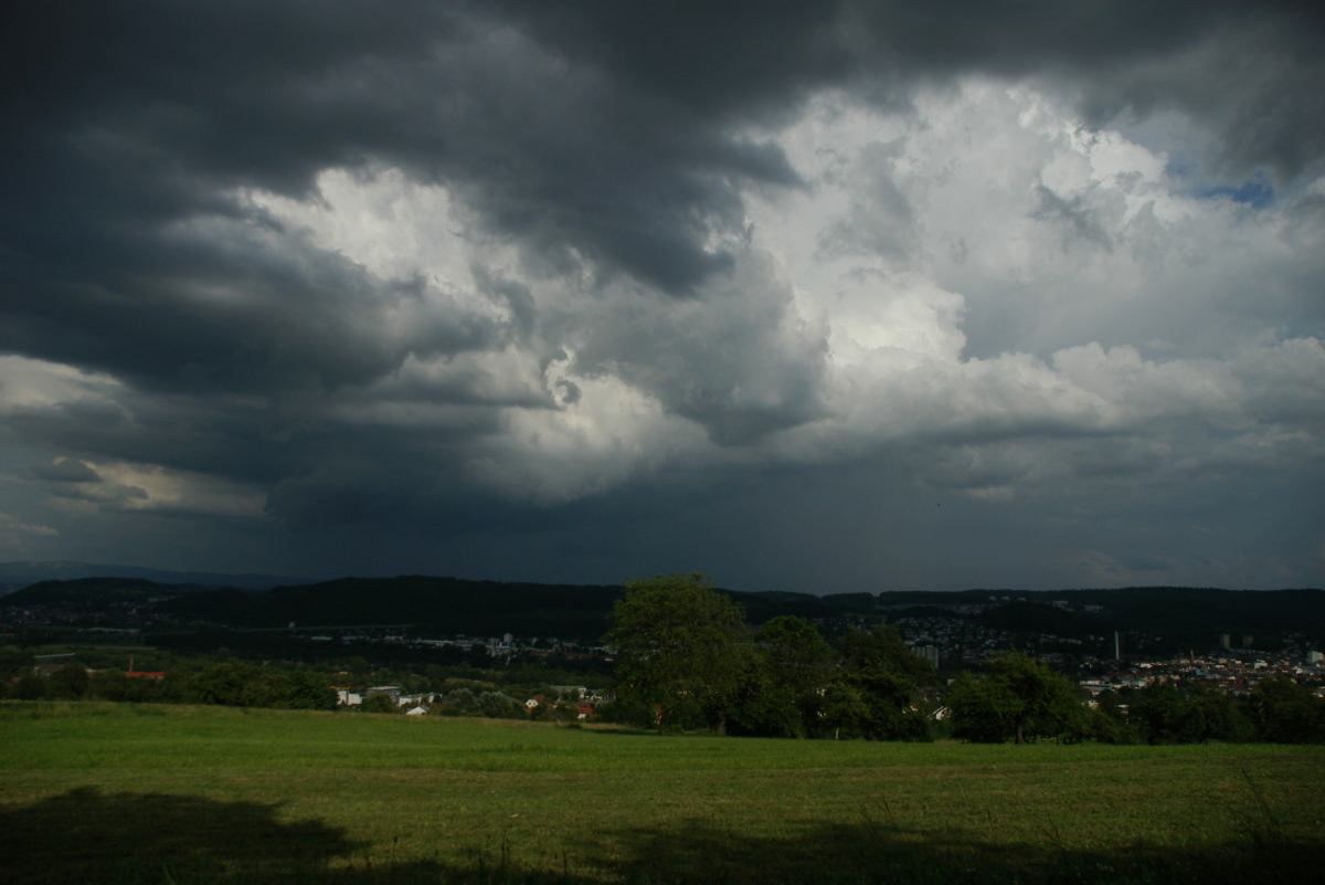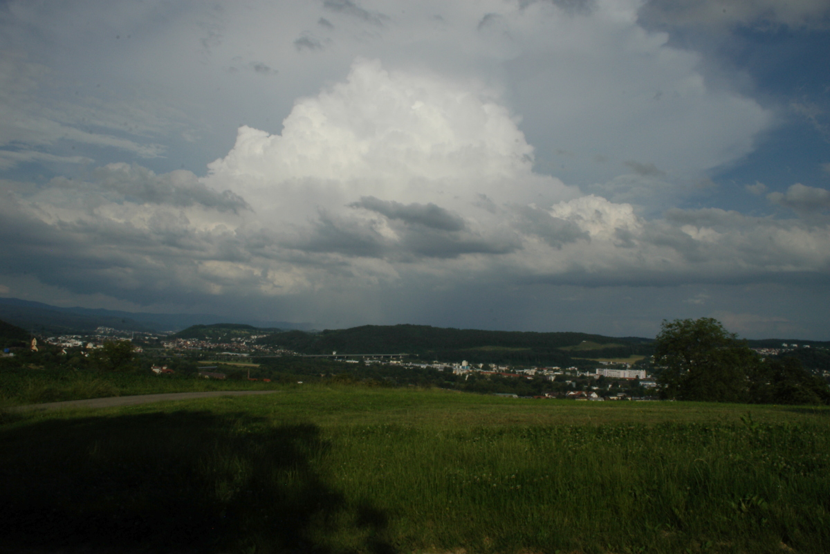 Ich war wieder einmal relativ spät dran, wenngleich ich es dank der langsamen Zuggeschwindigkeit der Zelle auch noch vor sie geschafft hätte. Da ich aber im Hinterkopf den Leftmover von letzter Woche hatte, postierte ich mich in der Nähe von Lörrach und beobachtete die Zelle aus etwas Entfernung. Blick in Richtung Weil/Basel, ein frischer Konvektionsschub geht durch den Aufwind. 17.54 Uhr: