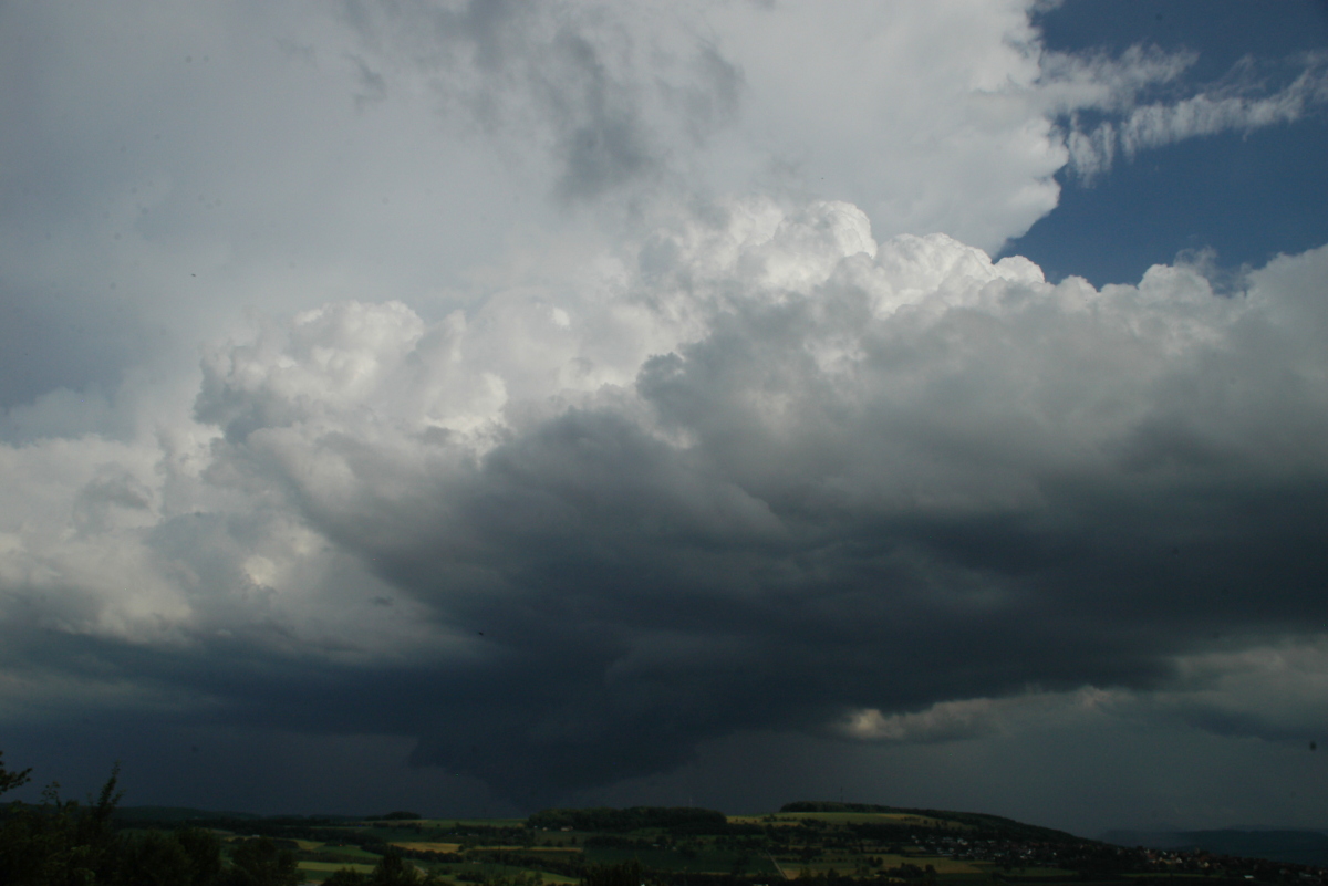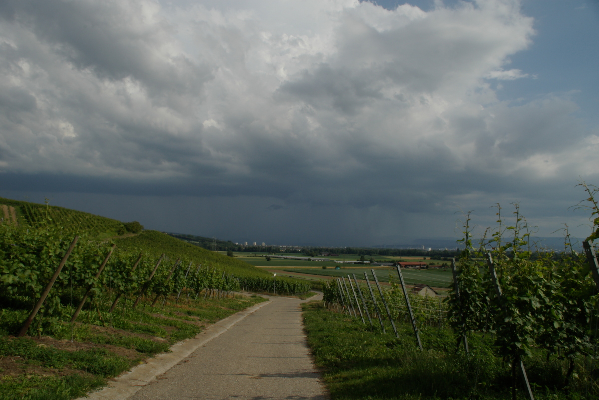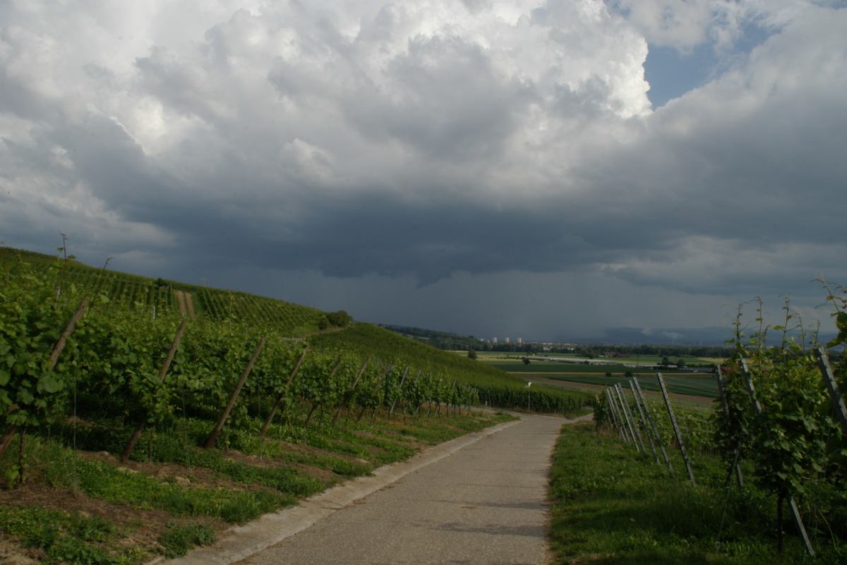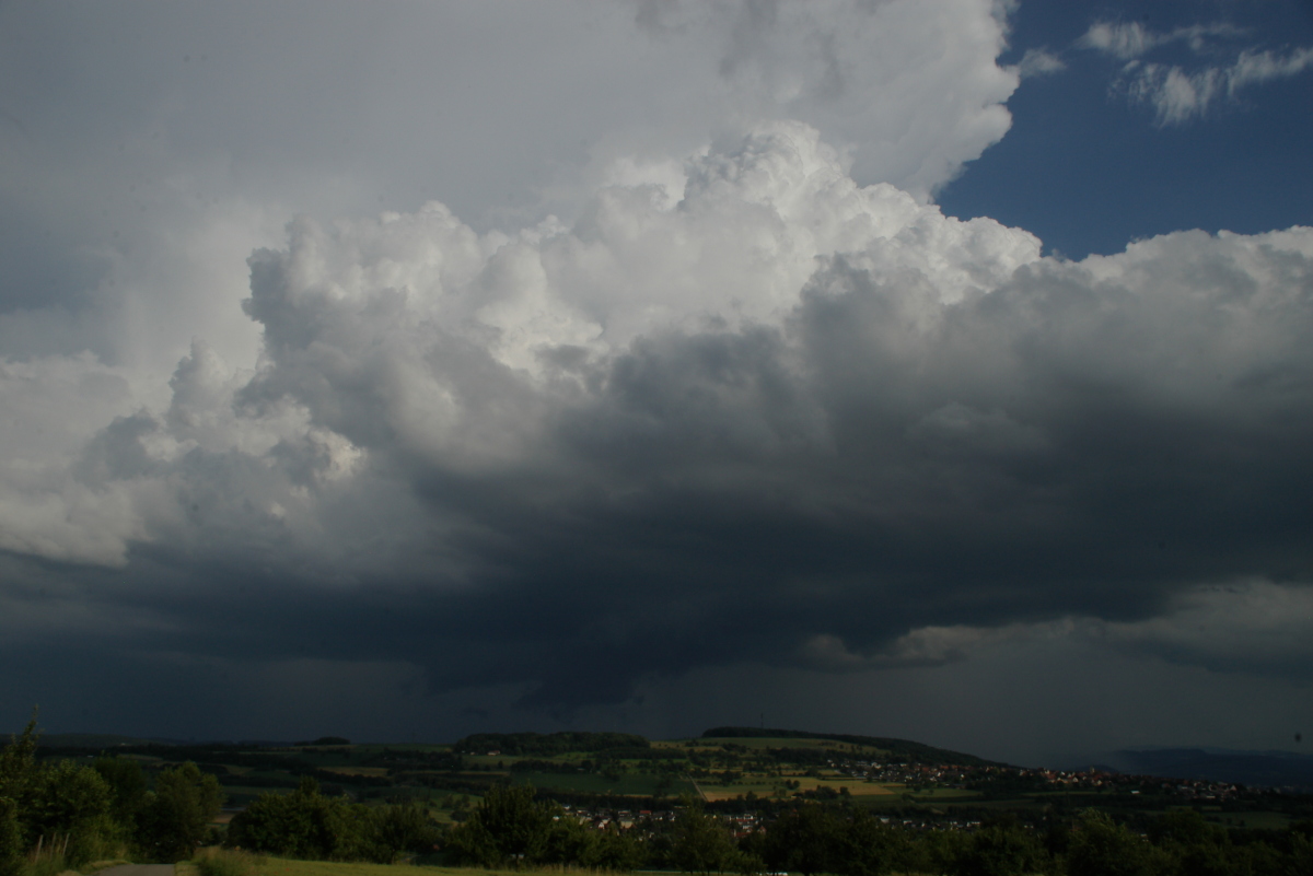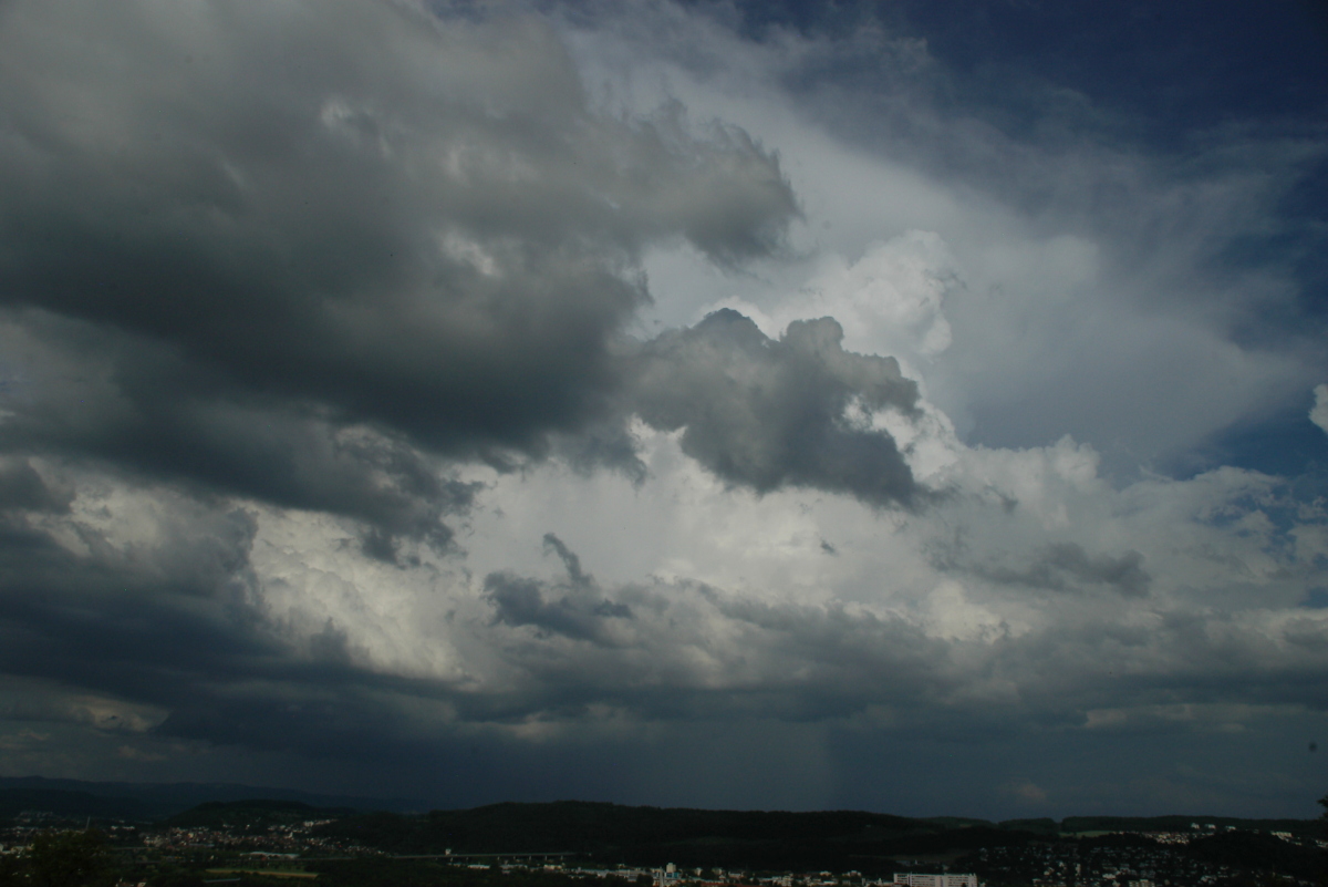 Ich war wieder einmal relativ spät dran, wenngleich ich es dank der langsamen Zuggeschwindigkeit der Zelle auch noch vor sie geschafft hätte. Da ich aber im Hinterkopf den Leftmover von letzter Woche hatte, postierte ich mich in der Nähe von Lörrach und beobachtete die Zelle aus etwas Entfernung. Blick in Richtung Weil/Basel, ein frischer Konvektionsschub geht durch den Aufwind. 17.54 Uhr:
