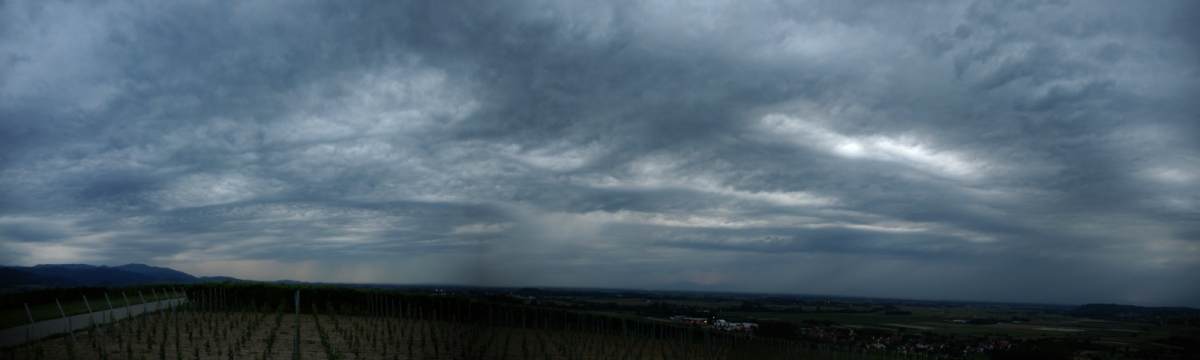 Nachdem wir die Radarloops beobachtet hatten, fuhren wir gegen 19.30 Uhr los auf den Batzenberg südlich von Freiburg. Obwohl die Zellen bei unserem Start in Freiburg schon die Vogesen erreicht hatten, war die Lage für uns recht undurchsichtig. Panorama mit Blick von SSW-NW, ~20.25 Uhr. Mitte links ist kein Tornado, sondern ein Panoramaknick