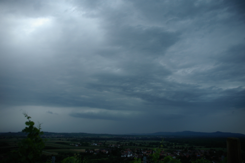 , die Fallstreifen am Ostrand der Vogesen sind dagegen echt - schräg. Unsere Aufmerksamkeit galt zu der Zeit eindeutig den Vogesen:Gute 10 Minuten (und einige unbeantwortete Fragen bezüglich der aktuellen Lage) später nahmen die Wolken deutlich Strukturen an. Genauer gesagt, schien sich am Kaiserstuhl eine Zelle zu bilden. Blick in Richtung NNW: