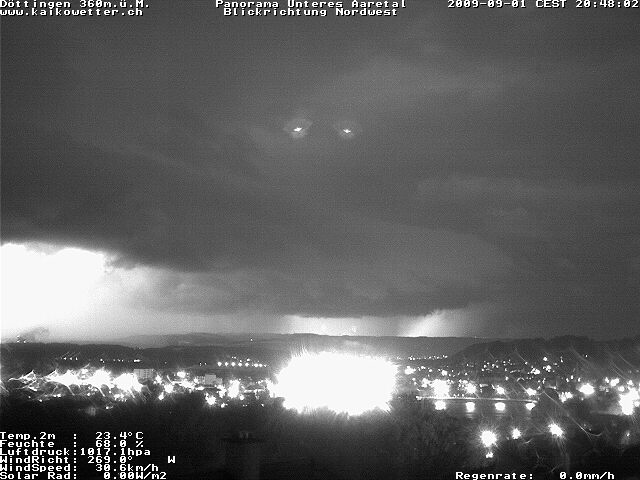 Eine durch Blitze erleuchtete Webcambildaufnahme zeigt die Wolkenstrukturen kurz vor dem Sturm: