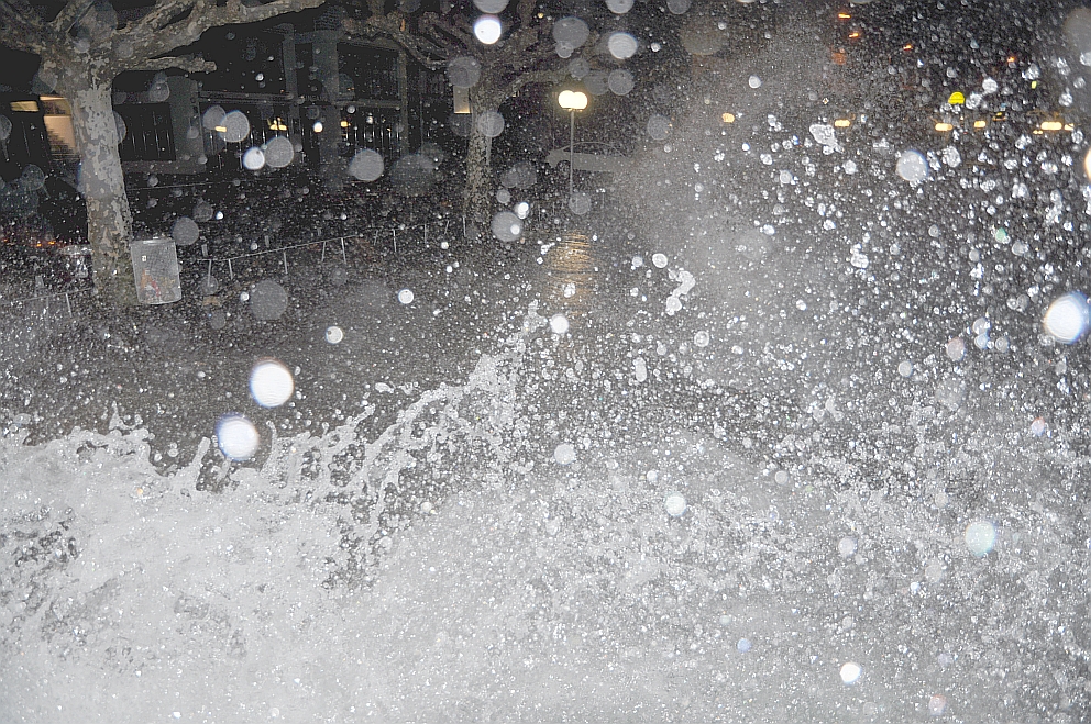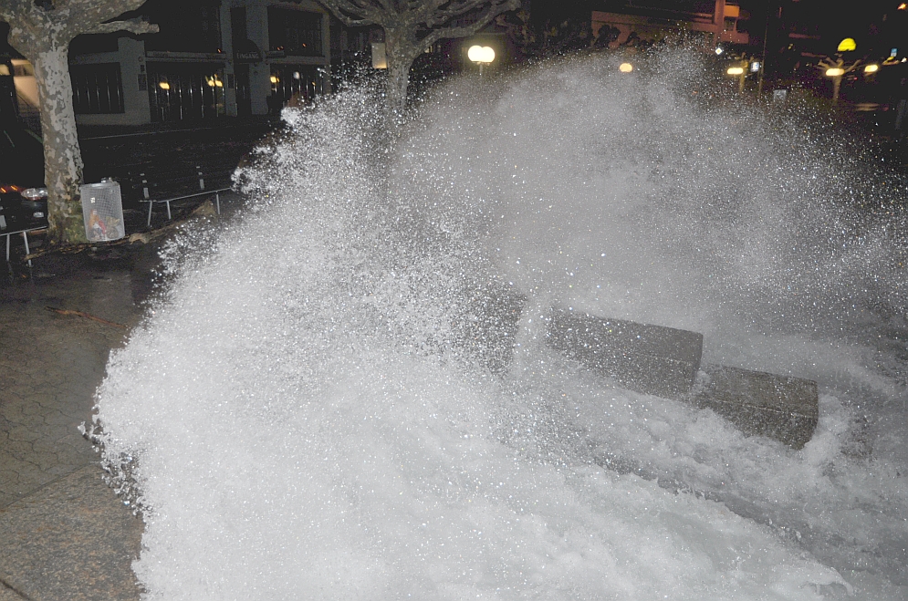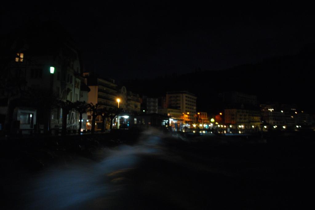 Hier zwei Bilder von dem hohen Wellengang in Brunnen. Die Wellen erreichten rund 1 Meter Höhe. Die Gischt spritze zum Teil bis 5 Meter in die Höhe und reichte zum Teil über 30 Meter aufs Land (Flugwasser). Bei Nacht ist die Szenerie schwierig festzuhalten.