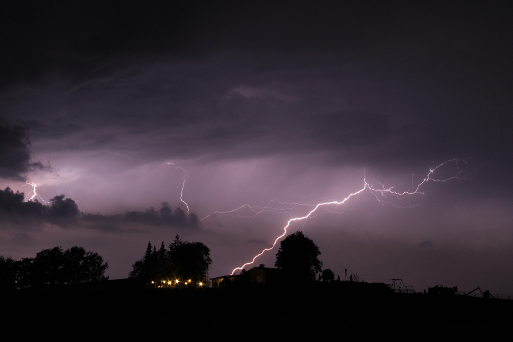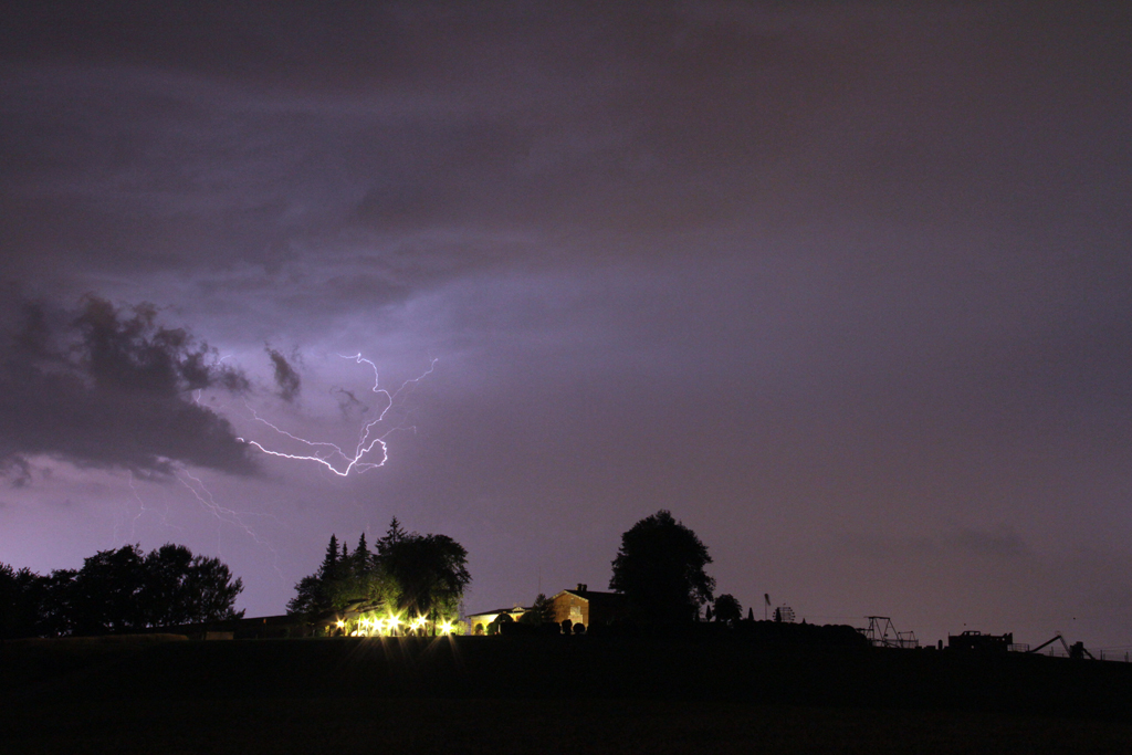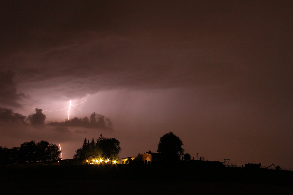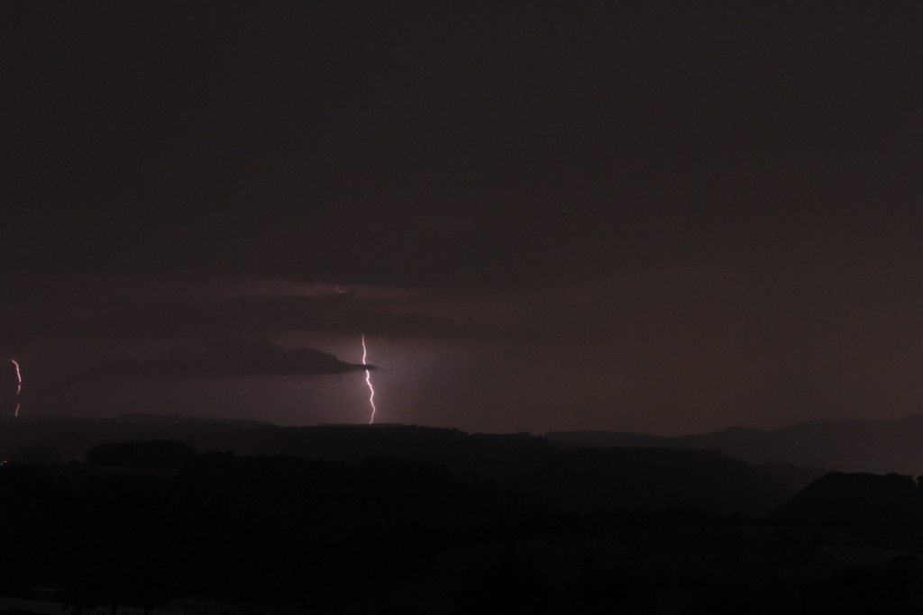 Vielen Dank für die vielen eindrücklichen Blitzbilder! Auch ich war gestern, nach einer langen Flaute, wieder einmal unterwegs. Wie Crosley erhoffte ich mir im Baselland die besten Chancen auf Blitzfotos und versuchte eine geeignete Stelle für die Baslerzelle zu finden. Unterwegs dorthin beobachtete ich um ca. 00.10 aus dem Auto einige wunderschöne Blitze, weshalb ich mich unglücklicherweise bereits bei Frick entschied, eine erhöhte Stelle zu finden. Nach dem ich mich daraufhin ein wenig verfahren hatte, entschied ich mich, etwas weiter in Schupfart Stellung zu beziehen. Dort gelang mir dann auch das eine oder andere Blitzfoto. Leider war ich aber relativ weit von der Basler-Zelle entfernt, wodurch nur selten deutlich sichtbare Blitze auftraten. Später, als ich mich endlich durchgerungen hatte, noch etwas näher an die Zelle zu fahren, begann es schon bald zu Regnen und die Blitzrate nahm deutlich ab.