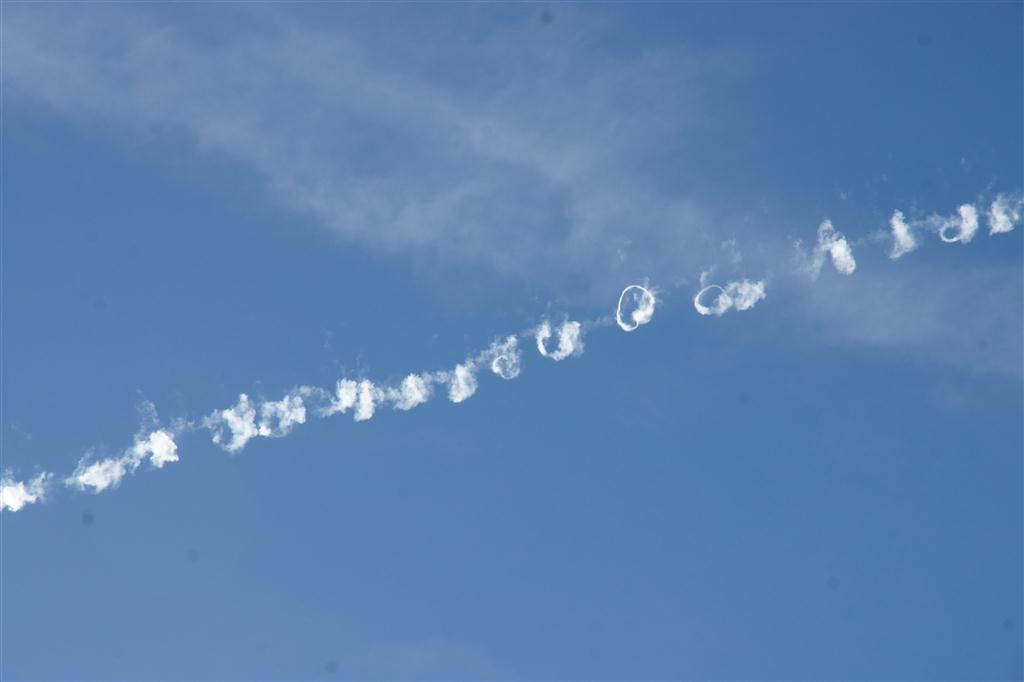 möglicherweise sind Deine aufgenommenen "Ringel" Kondensstreifen durch Verwirblungen entstanden...