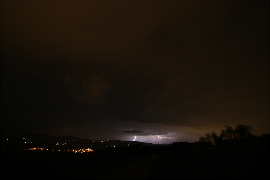 Um 22 40 Uhr kam der Anruf von Dominic (WolfCH), mit der Frage nach meiner Einschätzung. Fast gleichzeitig bildete sich in Frankreich eine kleine, blitzaktive Zelle. Ich fuhr nach Basel, Treffpunkt Pratteln. Dort angekommen, hatte sich in Frankreich eine ganze Linie gebildet, mit einer vorlaufenden Zelle am Vogesensüdfuss in Richtung Freiburg i. Br..
