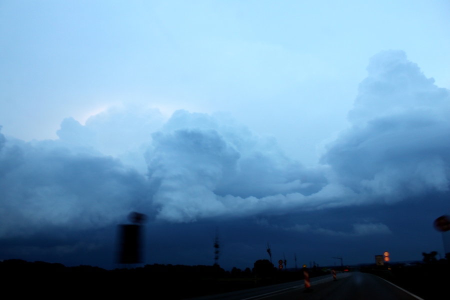 Da die Donauschiene um diese Uhrzeit eine recht gut verfolgbare Sache ist, beschlossen wir mit der Zelle mit zu fahren. Im Hagel, downburst-ähnlichen Wind und teilweise white-out gestaltete sich das natürlich schwer und es resultierte eine wirklich abenteuerliche Fahrt. Da die Sicherheit natürlich immer vor geht, war nur Schneckentempo und teilweise nicht mal das drin. Gerade solch kräftige Zellen bei Nacht sind nicht zu unterschätzen. Trotz Allem schafften wir es, dem starken Kern an der Donau bis kurz vor Ulm zu folgen. Dabei gab es immer wieder größeren und kleineren Hagel (wir fuhren insg. sicher 20-25min. im Hagel), heftige Böen und Dauergeflacker. Etwas nördlich von Munderkingen war die Straße von Hagel fast vollständig bedeckt.