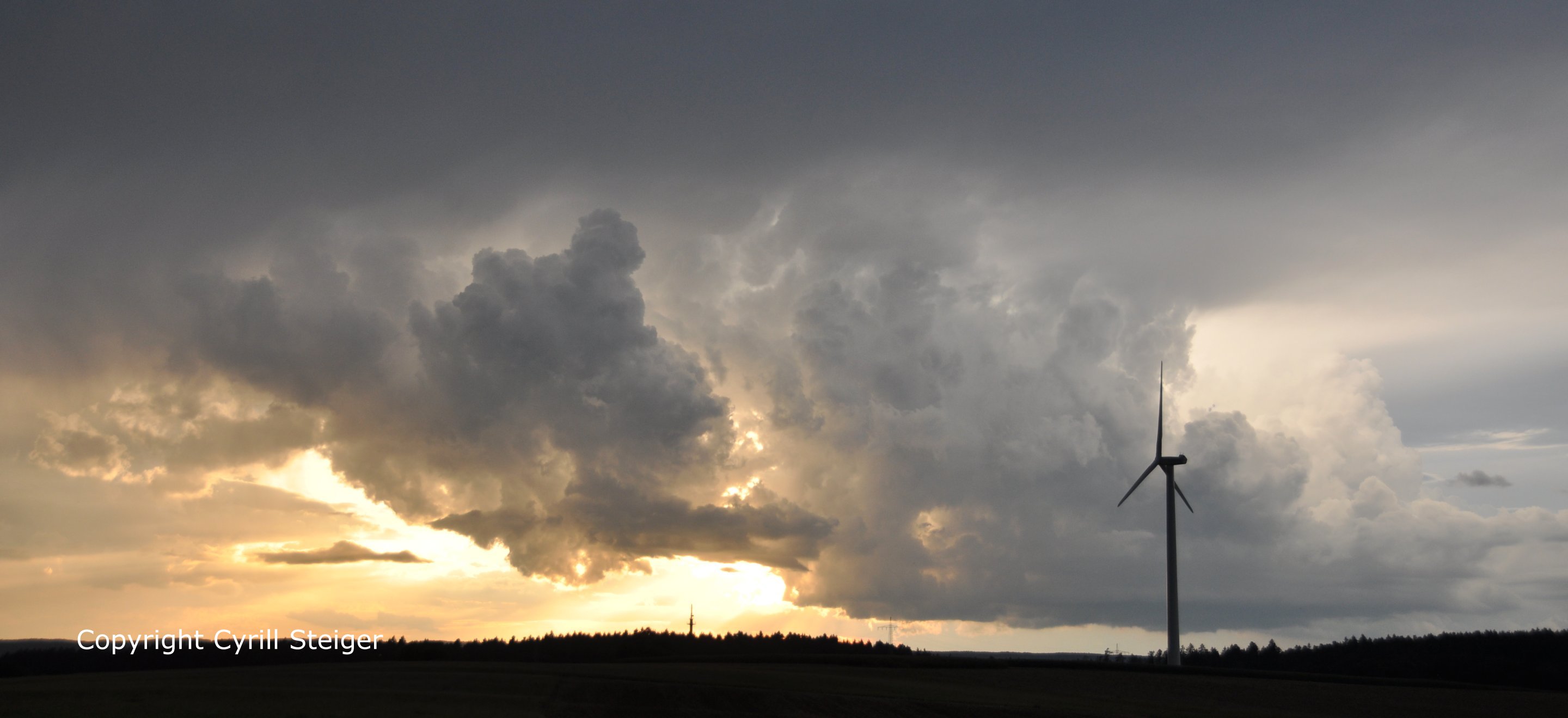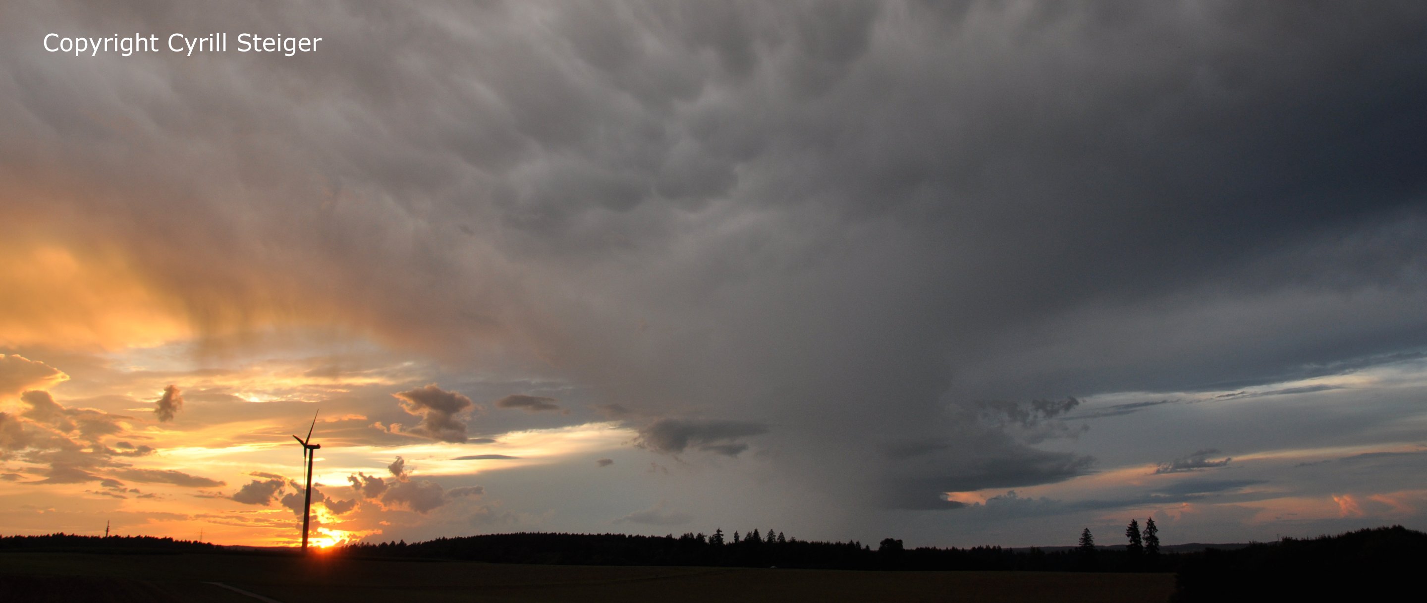 Ich entschied, die Linie in Villingen/Schwenningen abzufangen, nachdem ich gesehen hatte, wie die Zelle(n) bei Basel extrem verstärkten, doch sie überlebte(n) den Südschwarzwald nicht. Hier zwei Bilder der Ex-Baslerzelle im Auflösestadium, verbreitet Mammatus-Wolken produzierend.
