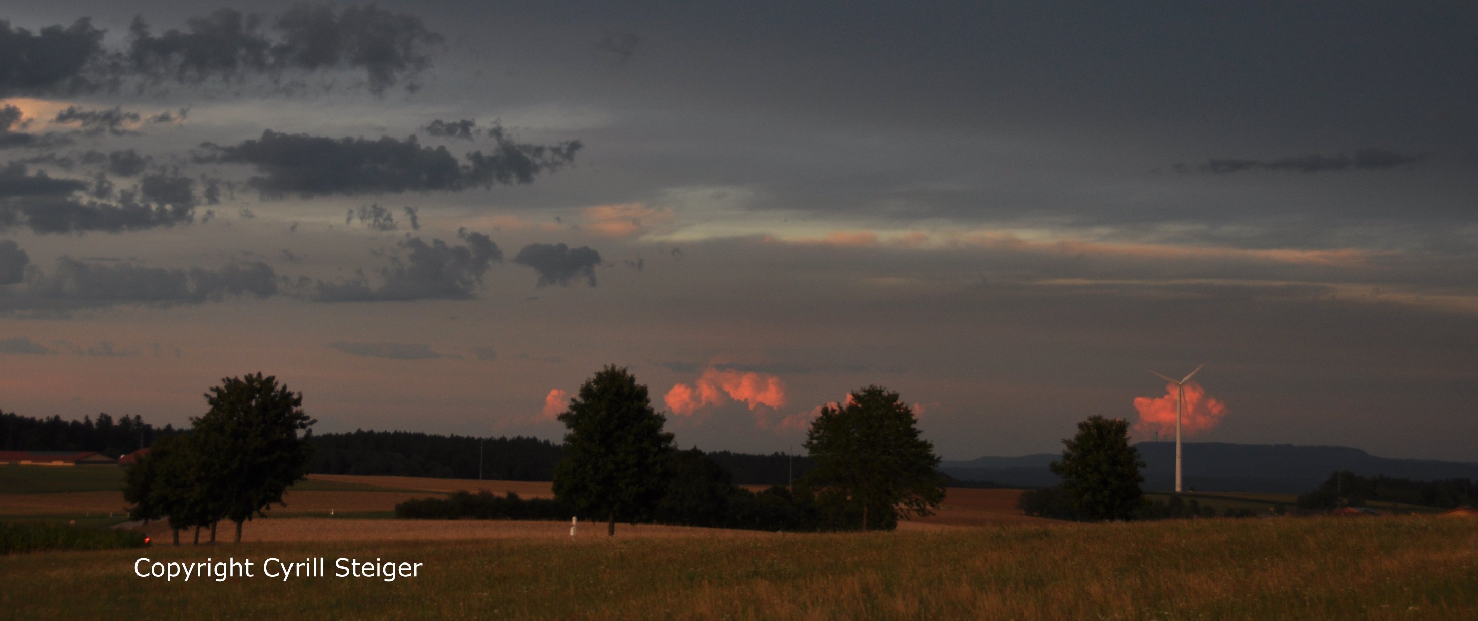 Natürlich hatten auch wir es auf den Brummer aus dem Jura abgesehen. Leider war ja recht früh schluss. Dennoch gabs Unerwartetes zu sehen: Vermutlich outflow-getriggert bildeten sich auf dem Hochschwarzwald etwa Höhe Oberndorf a. N. einige Cu, welche bereits früh unsere Aufmerksamkeit hatten: