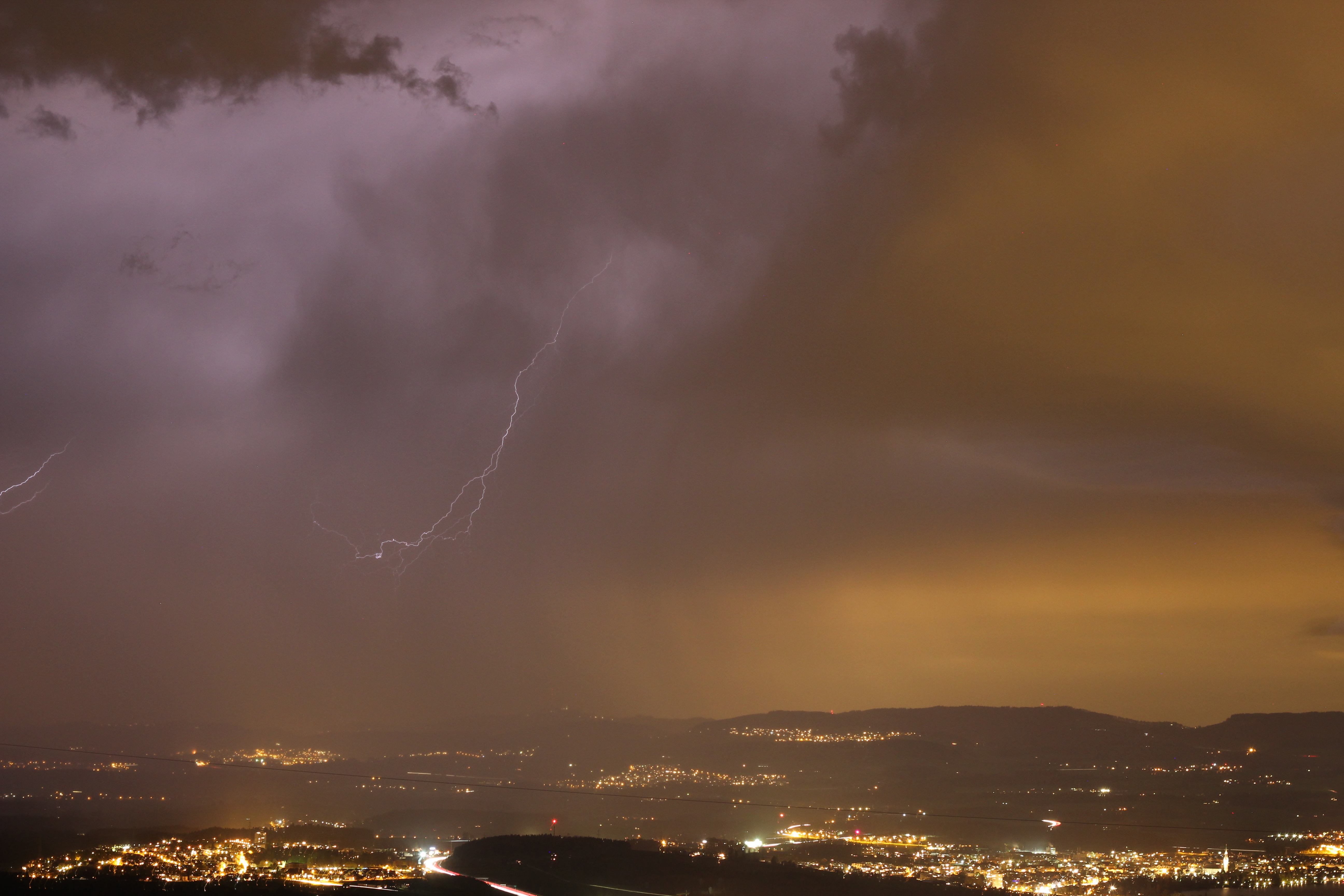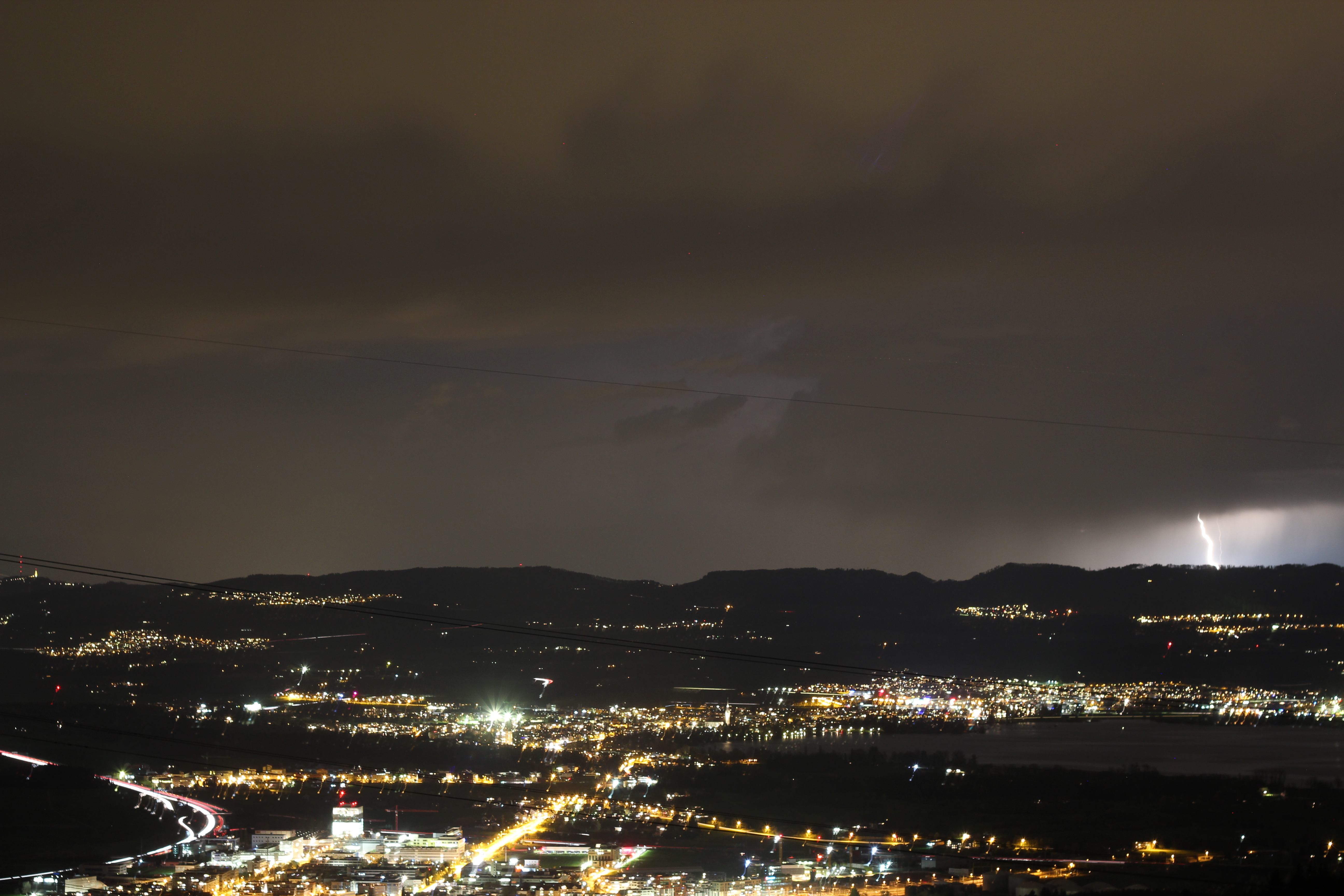 Hier ein Blitz um 21:17, der wurde oben schon erwähnt. Die Richtung könnte Stimmen, ich hab es auf Swisstopo.ch nachgeschaut. Die Distanz bis östlich von Wiesendangen wären dann etwas mehr als 50km vom meinen Standort (unten ist Rotkreuz, rechts im Bild der Zugersee, dahinter Cham und Steinhausen und im Hintergrund der Albis.