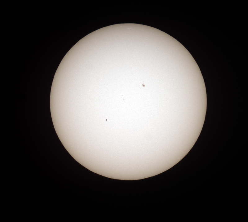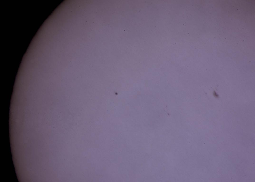 Merkur vor der Sonne, links und ein Sonnenfleck, rechts (2. Bild)
