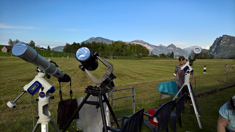 Hier noch die Armada an Geräten, mit denen wir gleichzeitig beobachtet haben. Die waren während des Regens abgedeckt haben aber weiter auf die Sonne nachgeführt, dass wir beim Aufklaren nicht lange suchen mussten.