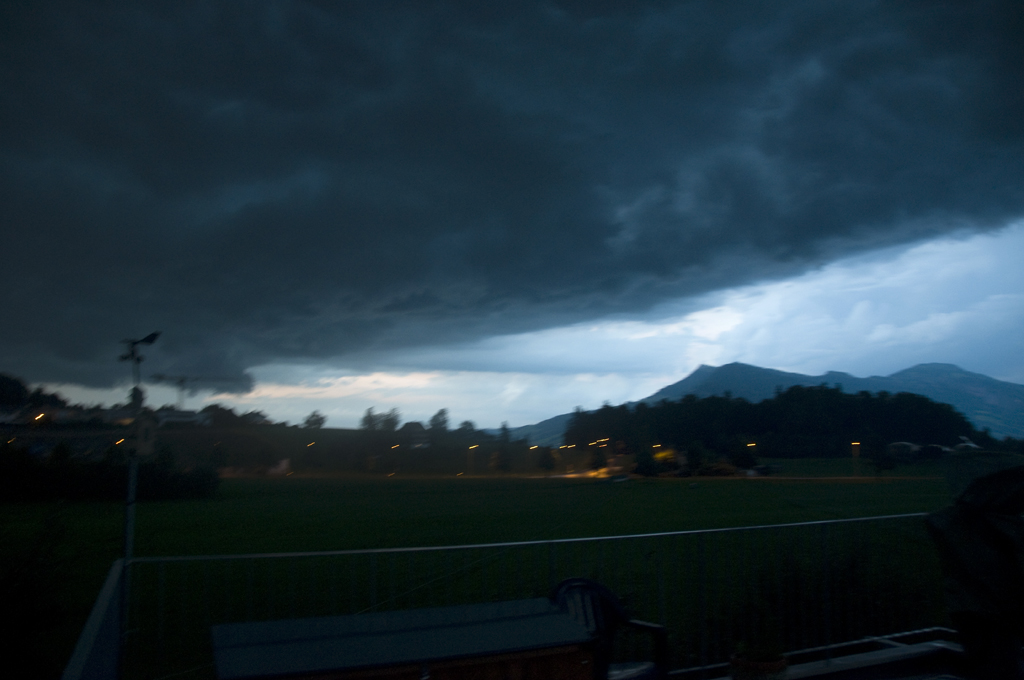 Sieht vielversprechend aus, Geflacker ist aus der Wolke schon zu sehen und es zieht sehr schnell zu. Inzwischen ist es fast ganz dunkel. Spannend, endlich kriegen wir auch mal etwas davon ab.