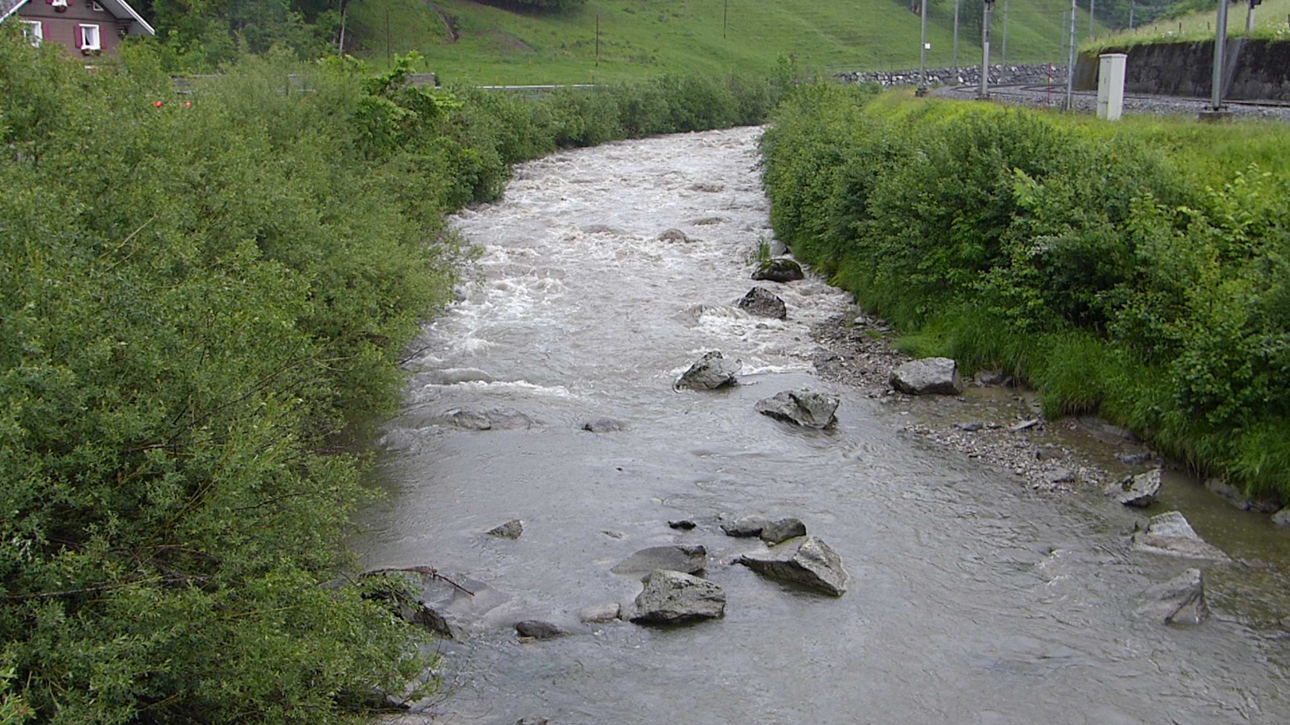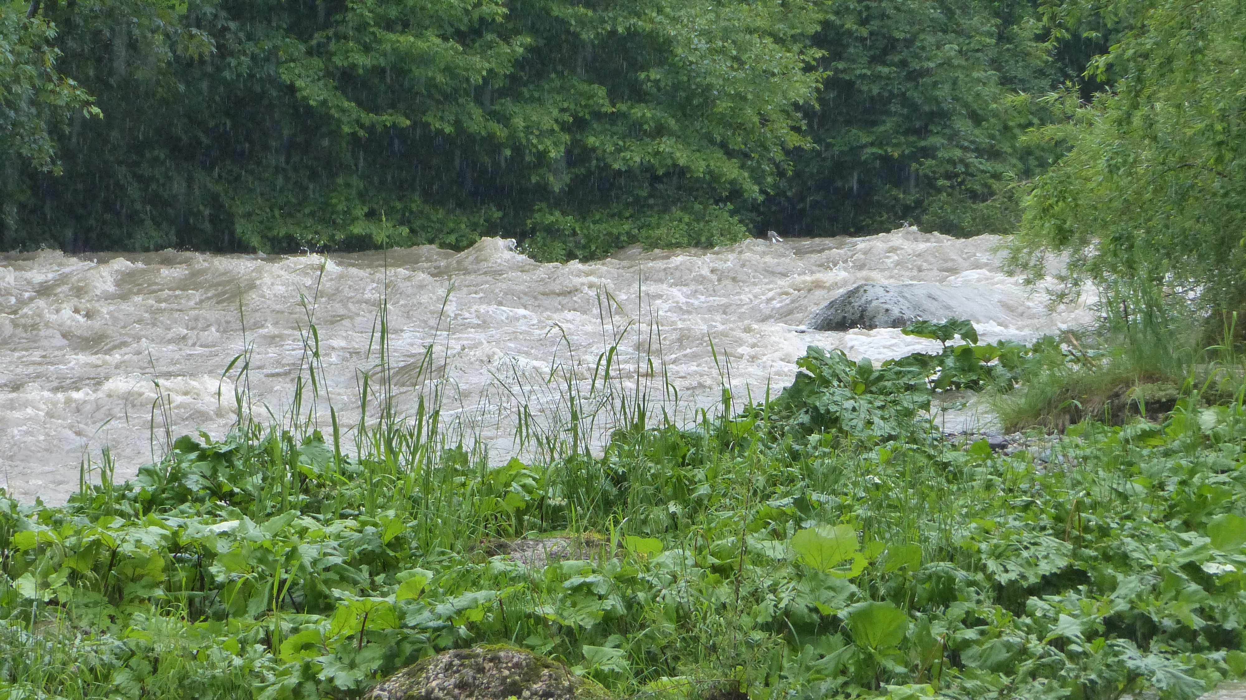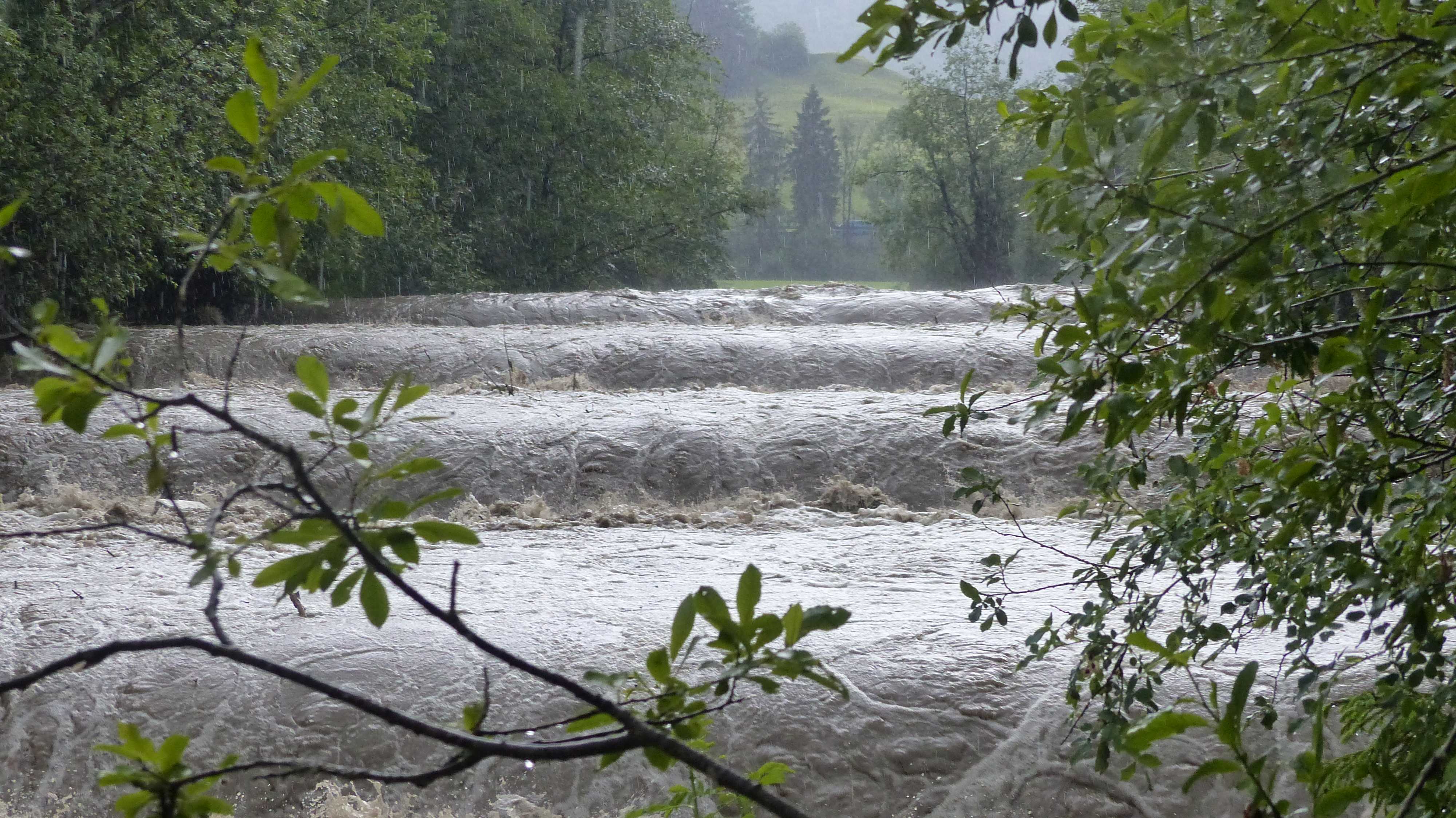 Die Messstation Alp – Einsiedeln des BAFU hat folgende Daten registriert. Der Abfluss stieg von 0.473m³/sec auf 36m³/sec. Der Pegel stieg von 840.18m auf 841.23m. Um an der Grenze zu GS2 zu kratzen müsste die doppelte Menge Wasser die Alp herunterfliessen. Diese Sturzflut befand sich also noch im grünen Bereich ist aber trotzdem ein beeindruckendes Erlebnis, wenn man das vor Ort miterleben darf.
