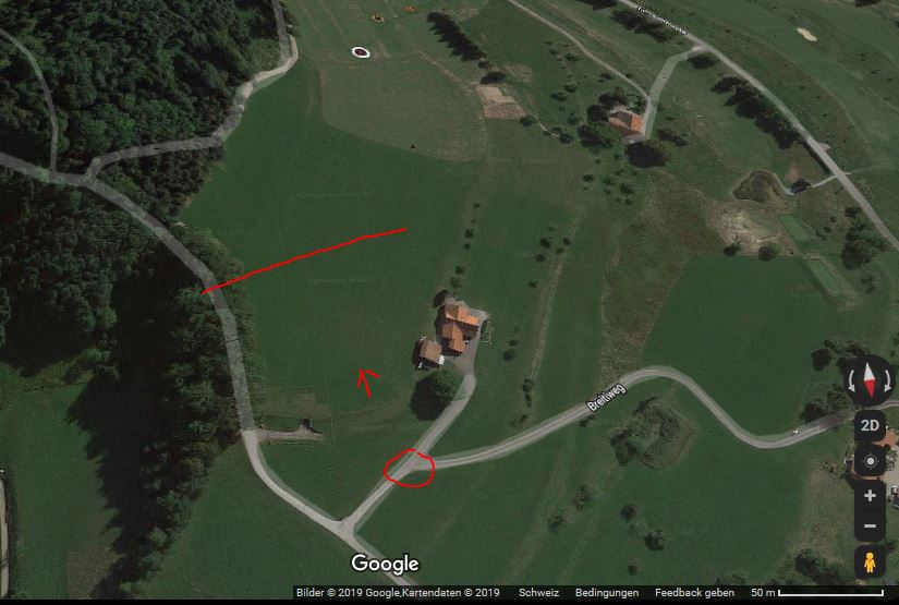 Roter Kreis mein Standort. Rote Linie: dort muss der Blitz eingeschlagen haben. Ihc wollte auf Kachelmann de diesen Blitz heraussuchen. Doch die Seite scheint tot...