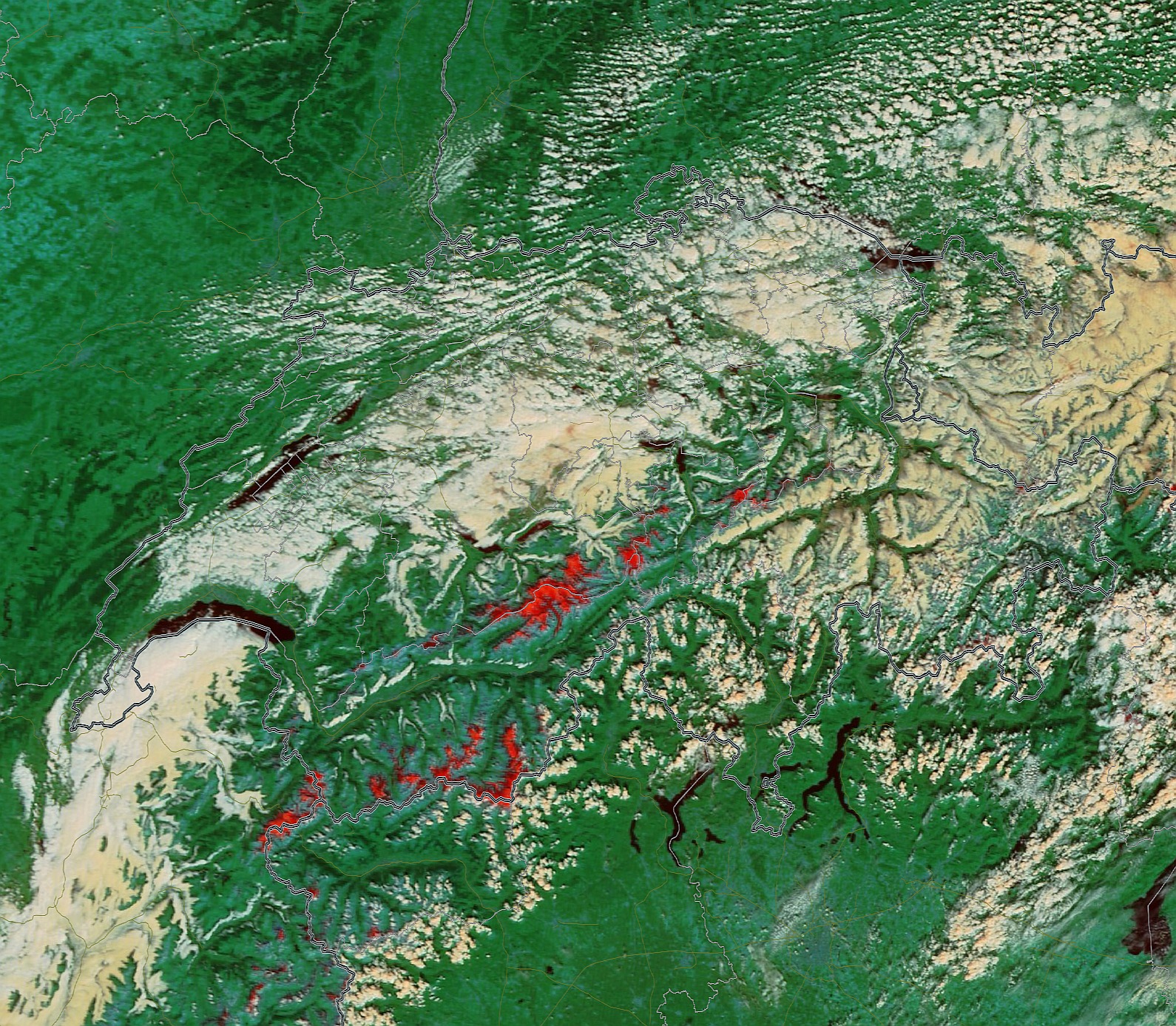 Handkehrum sieht man schön die von Wind und Feuchte abgewandten Gegenden resp. Streifen mit Absinken, die fast wolkenlos waren: