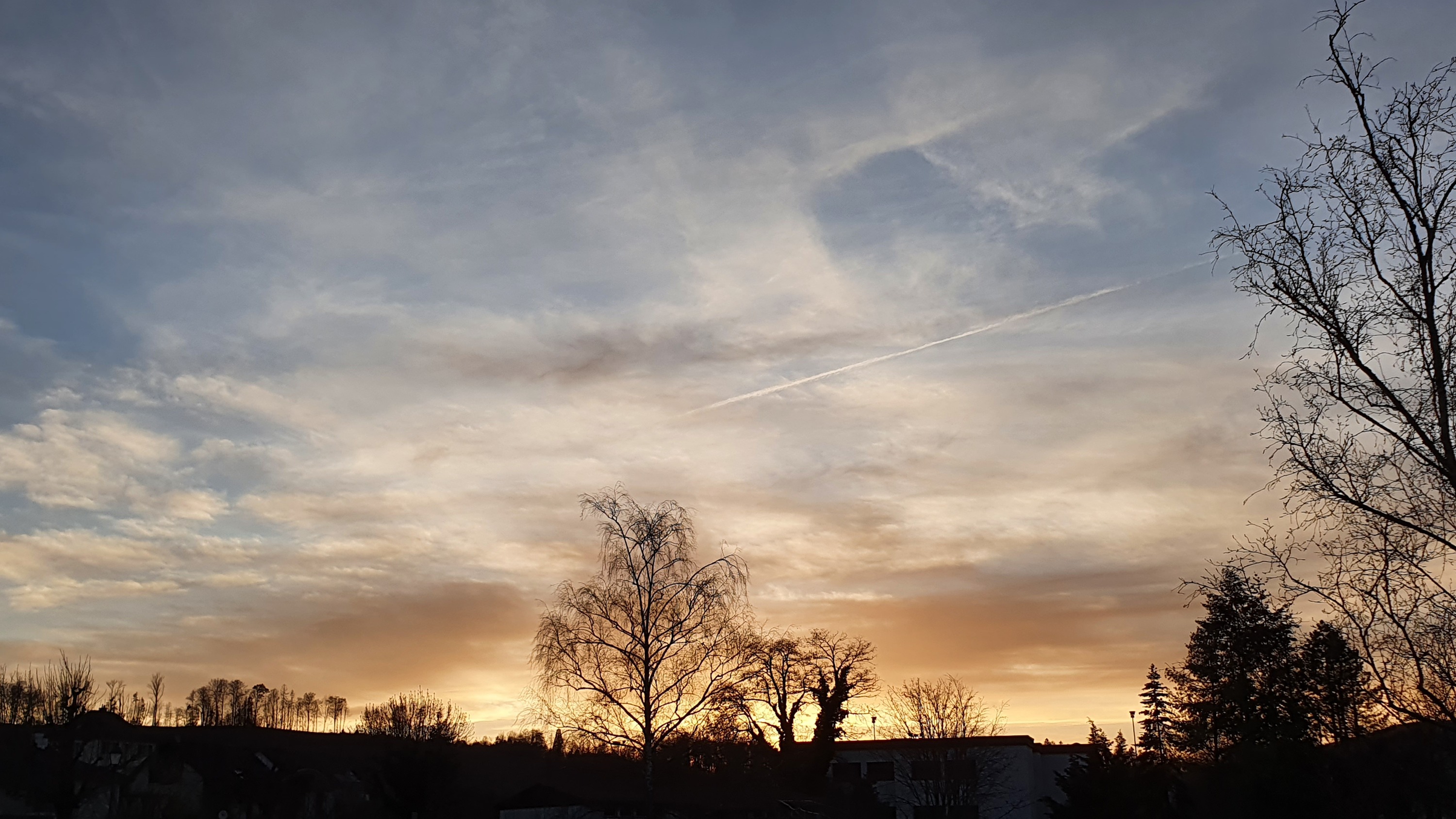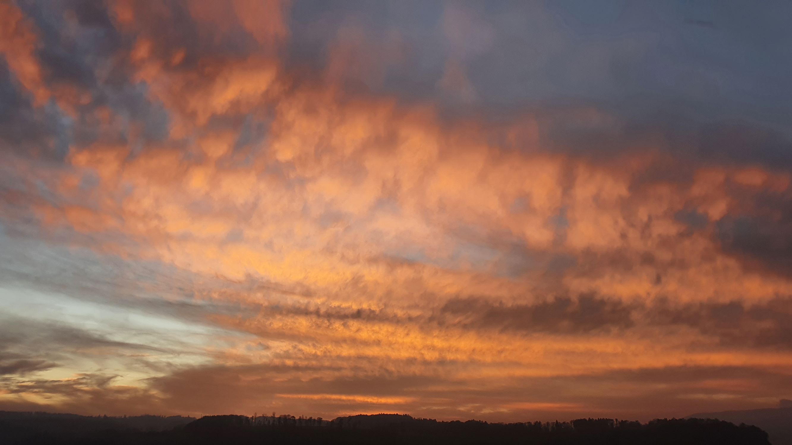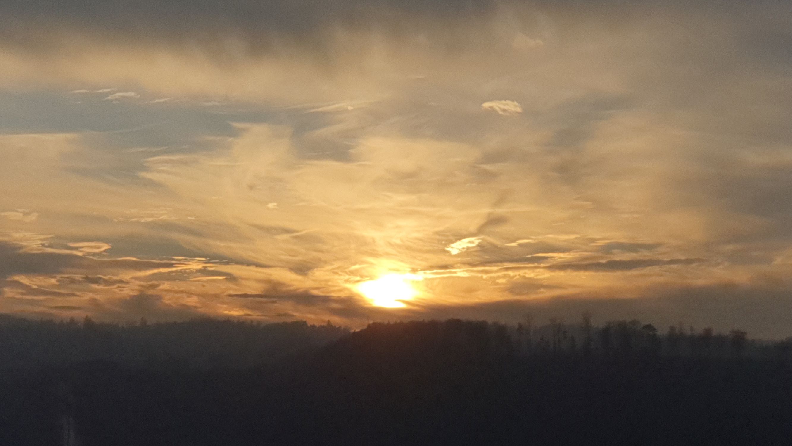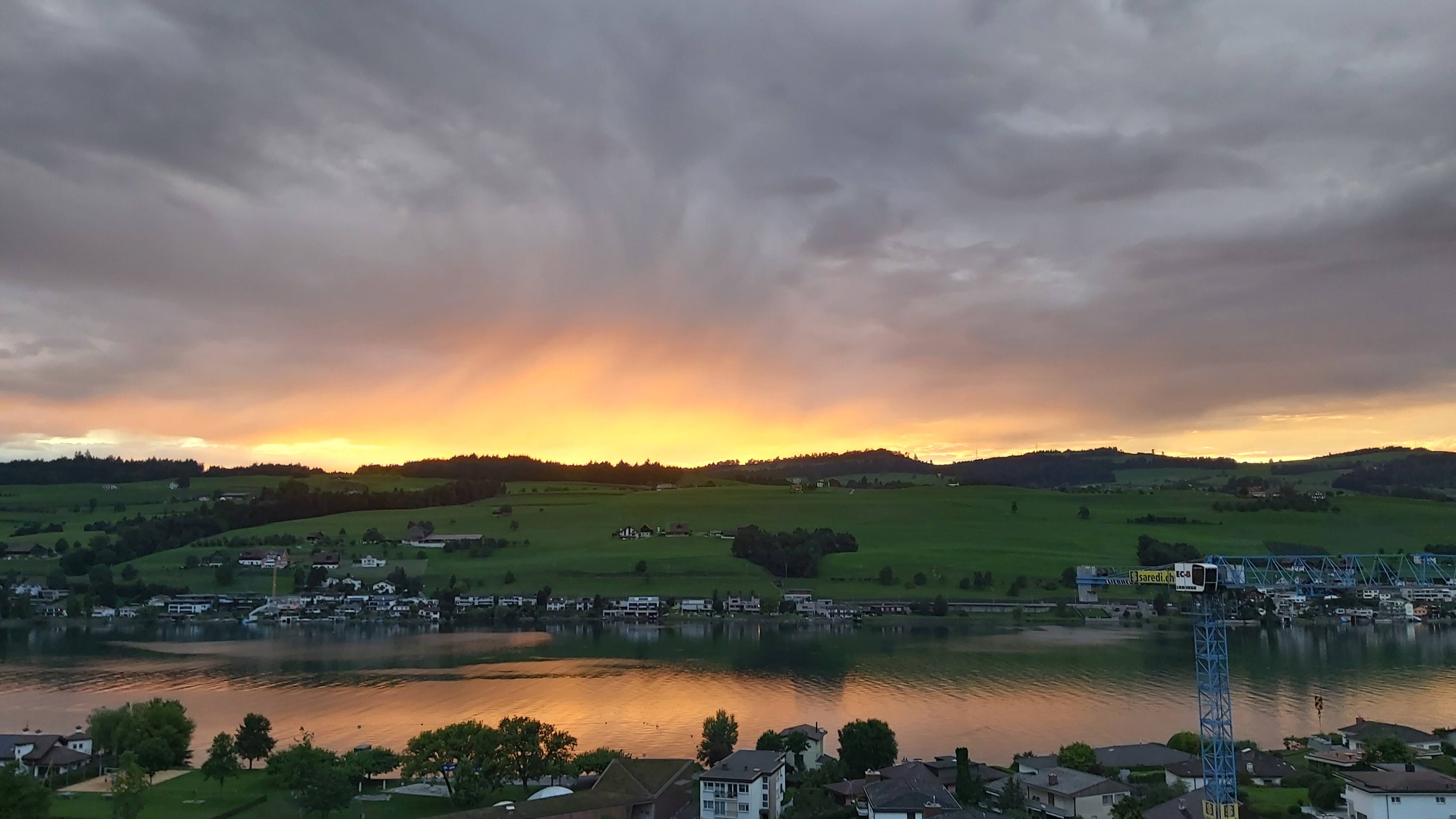 Der Sonnenuntergang mit Regenschauer davor, der aber wahrscheinlich nicht bis an den Boden reicht.