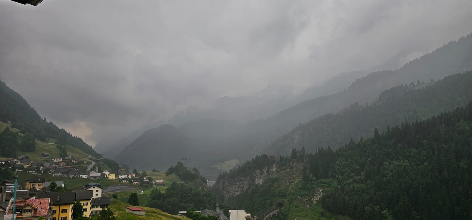 Habe mich für die Nacht in Airolo einquartiert, wo seit kurzem Donnergrollen wahrnehmbar ist. Ein kräftiger aber kurzer Regenschauer ging schon durch, ein weiterer zieht auf. So sieht es hier zurzeit aus: