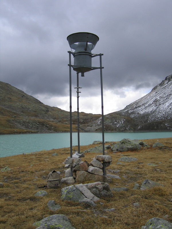 Totalisator für Niederschlagsmessung beim oberen Jörisee, im Hintergrund ein sich bildendes neues Gewitter