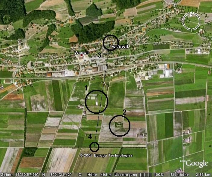 3 möglicher Standort (auf dem Bild ist dieser um ca. 200 m falsch eingezeichnet, ohne Zustimmung des Fotografen dürfte ich die herausgefundene Position nicht preisgeben - Internetcharta lässt grüssen! Mich schaudert jedoch die Tatsache, dass man mit solch einem Bild von Zuhause aus Adressen herausfinden kann...)