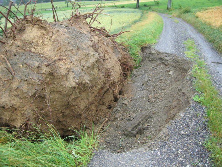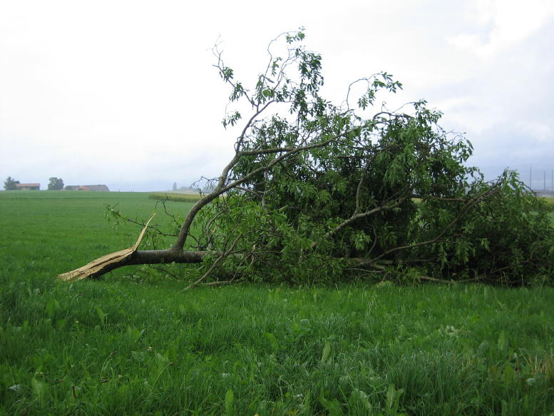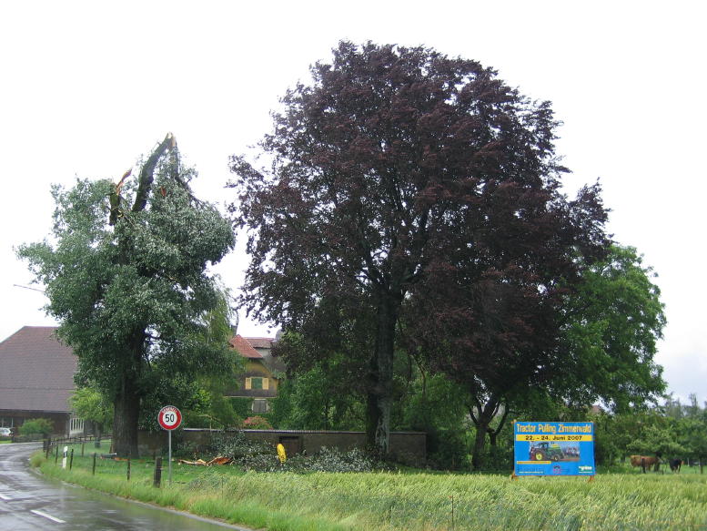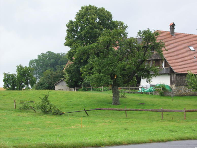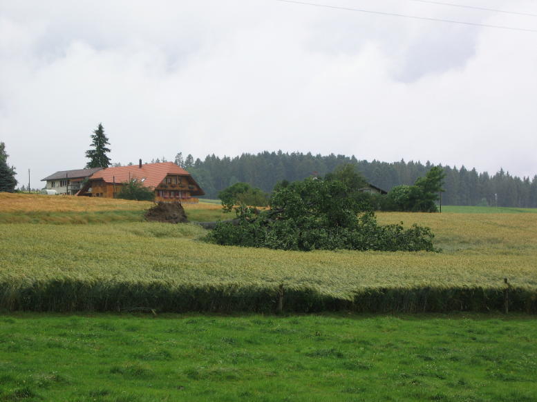Bis Niedermuhlern (zwischen Riggisberg und Zimmerwald gelegen) hielten sich die Windschäden in Grenzen. Dort vermutete ich vielmehr Schäden durch Hagelschlag, d.h. viel Laub lag unter den Bäumen. In der Region um Zimmerwald muss definitiv ein downdraft oder sogar burst gewütet haben. Abgedeckte Häuser fand ich aber trotzdem keine (gut, bis auf einzelne Ziegel).