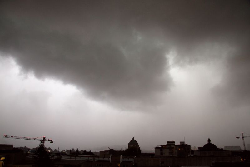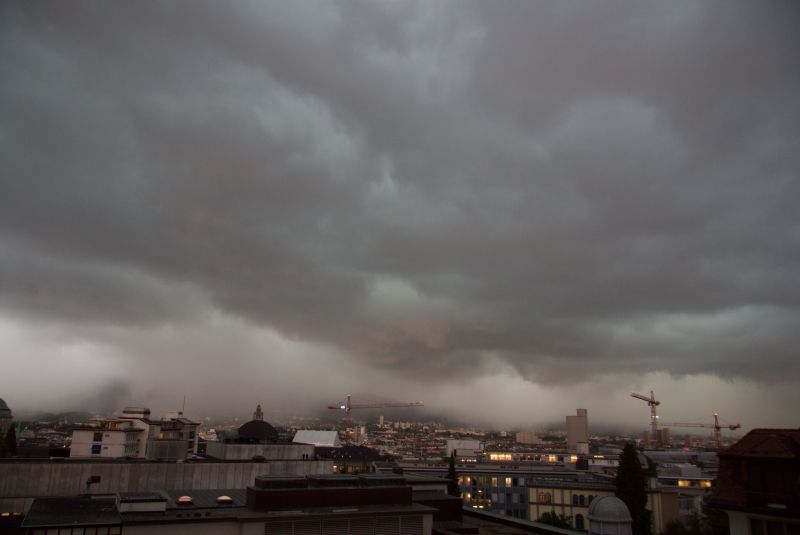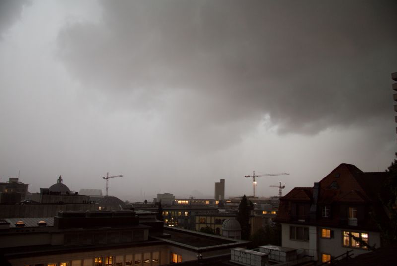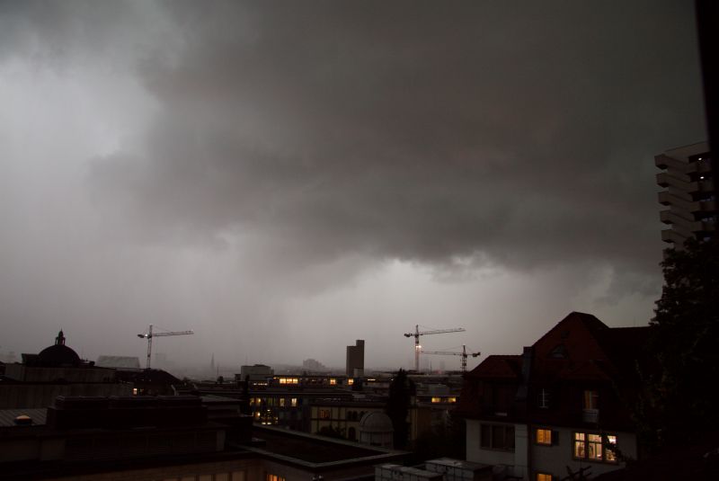 Fast den ganzen Rückweg schiebe ich das Velo auf dem Gehsteig auf der windgeschützten Seite der Häuser. Das hat auch den Vorteil, dass ich nahezu trocken nach Hause komme. Dort angekommen, kann ich das abziehende Gewitter im Südosten beobachten: