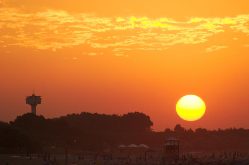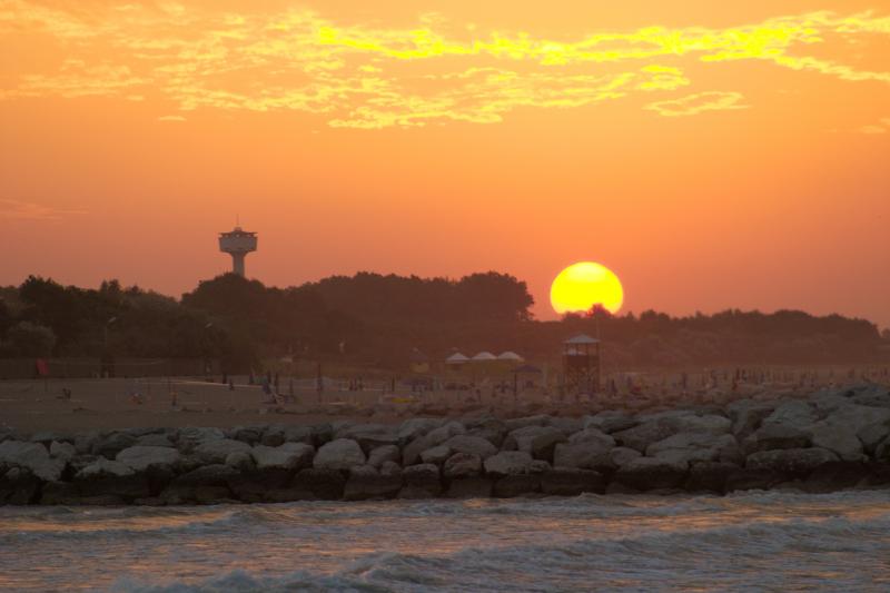 Die Sonne erscheint in Richtung Jesolo neben dem Wasserturm des Union Lido.