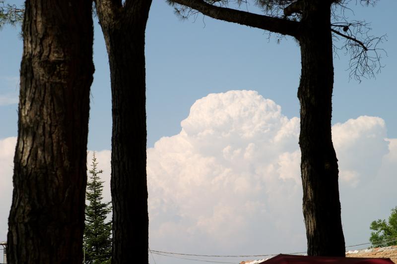 Als sich der Wolkendeckel verzogen hatte bildeten sich in Richtung Alpen Wolkentürme. Die erste schöne Entwicklung von Gewitterzellen. Durch den starken Wind verblasen zog sich alles in die Breite. Weiter setzte die Zelle in Richtung Westen immer wieder an.