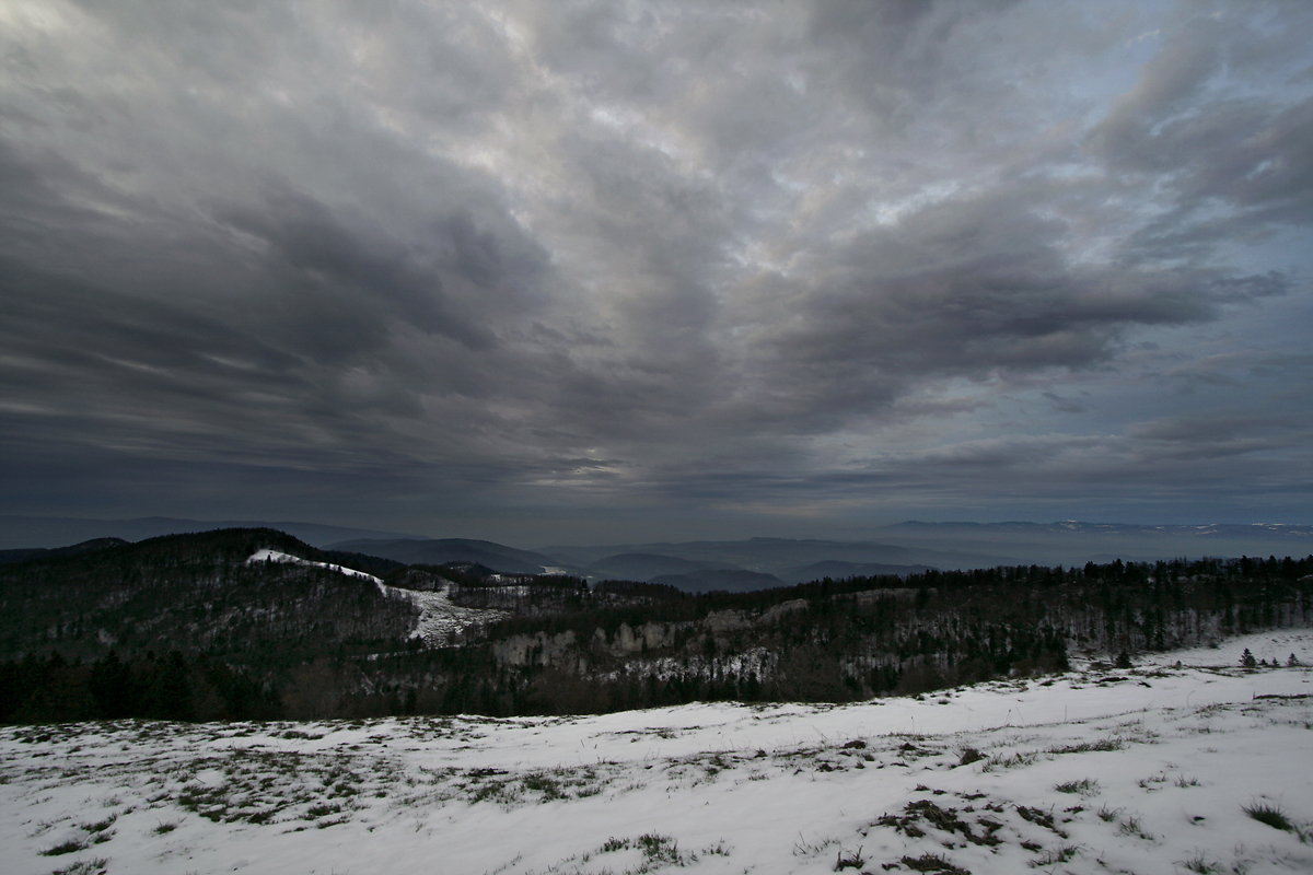 Blick vom Passwang Richtung Norden. Rechts der Mitte die Kuppe des Gempen,