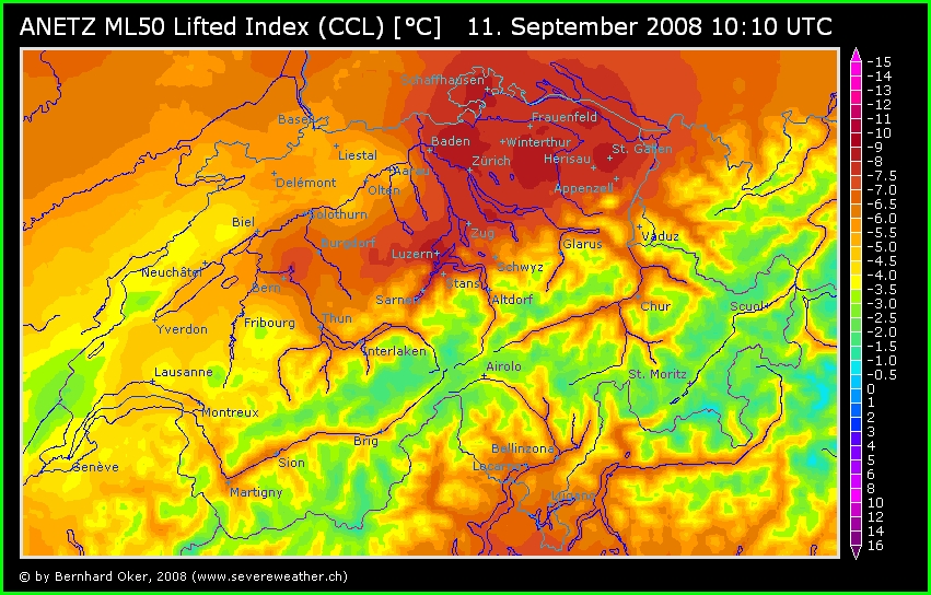 Bild 05: Der Lifted Index in der Ostschweiz sah aber sehr vielversprechend aus, doch auf den Satellitenbildern war noch überhaupt NICHTS zu sehen. Ich zog mal Wattwil in Betracht; war ein paar Mal so dieses Jahr.