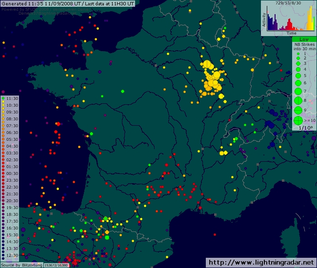 un petit front orageux passe en ce moment sur Genève...l'activité est faible.