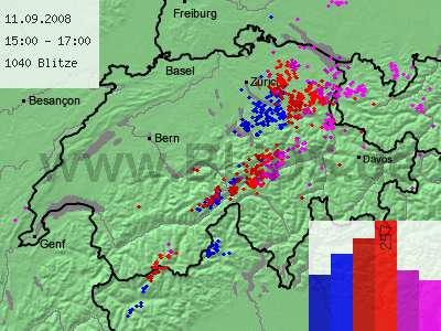 Bild 08: Plötzlich, wie aus dem Nichts formierte sich nördlich von Interlaken eine Zelle, die um 14:05 die ersten Blitze produzierte. Sie verstärkte sich sogar und zog über Luzern, bis nach Zug, in einem massiven Tempo. Erfahrungsgemäss zieht diese Zelle bei dieser Strömung über Wattwil. Um ca. 15:00 Uhr fuhr ich in Winterthur los und war um ca. 15:45 Uhr vor Wattwil, als im Südwesten eine schwarze Wand auf mich zukam. Hektik; erste Blitze zuckten, schlechte Sicht im Tal. Eine Bäuerin erklärte mir den Weg zur besseren Aussicht; dann beginnender Feierabendverkehr. Um 16:00 Uhr bezog ich meine Position. Plötzlich teilte sich vor mir die schwarze Wand und der Stress begann von Neuem, da es links von mir (östlich) fast so blitzaktiv war, wie rechts (westlich). Ich stand mitten drin und filmte den westlichen Teil (im obigen Bild sieht man deutlich die V-Form der sich teilenden Zelle). Dann vermutete ich, dass der östliche Teil sich noch mehr verstärkt und dies die Zelle nach München werden wird. Doch mit dieser hohen Geschwindigkeit (ca. 65-70 km/h) ist sie im Feierabendverkehr (es war ca. 17:10 Uhr) kaum mehr einzuholen.