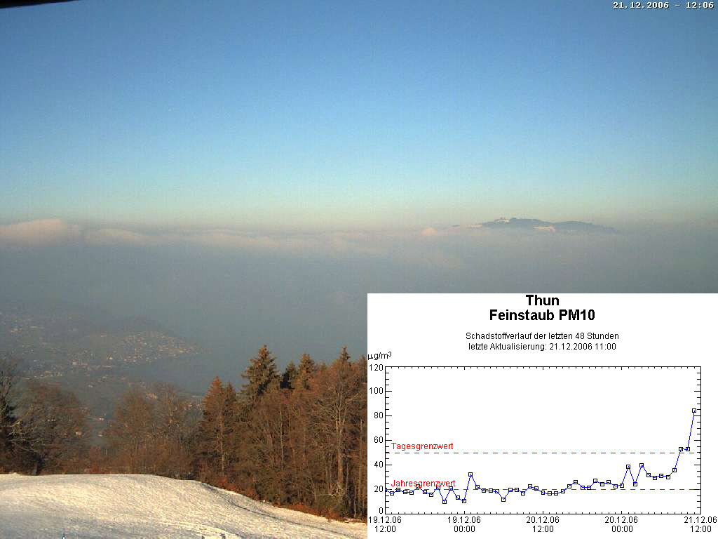 Momentan sind die Voraussetzungen für sehr hohe Feinstaubwerte (noch) nicht besonders gut. Der Deckel über dem Mittelland ist nicht hermetisch zu, immer wieder drückt die Sonne durch. Nicht nur der Wind, auch die Sonneneinstrahlung wirkt sich so gesehen hemmend auf die Schadstoffkonzentration aus. Der ideale Nährboden für Feinstaub und Co. ist eine kompakte, über viele Tage hinweg lückenlose Hochnebeldecke über dem Mittelland. Dann sammelt sich das Zeug an wie nix. Diese Konstellation haben wir allerdings nicht, deshalb sind v.a. die Feinstaubwerte eher tief (so zwischen 10 und 20 µg/m³, der Grenzwert liegt bei 50 µg/m³).