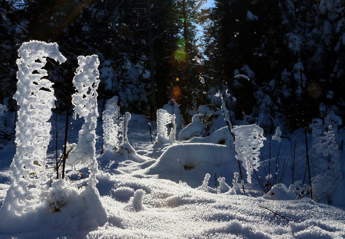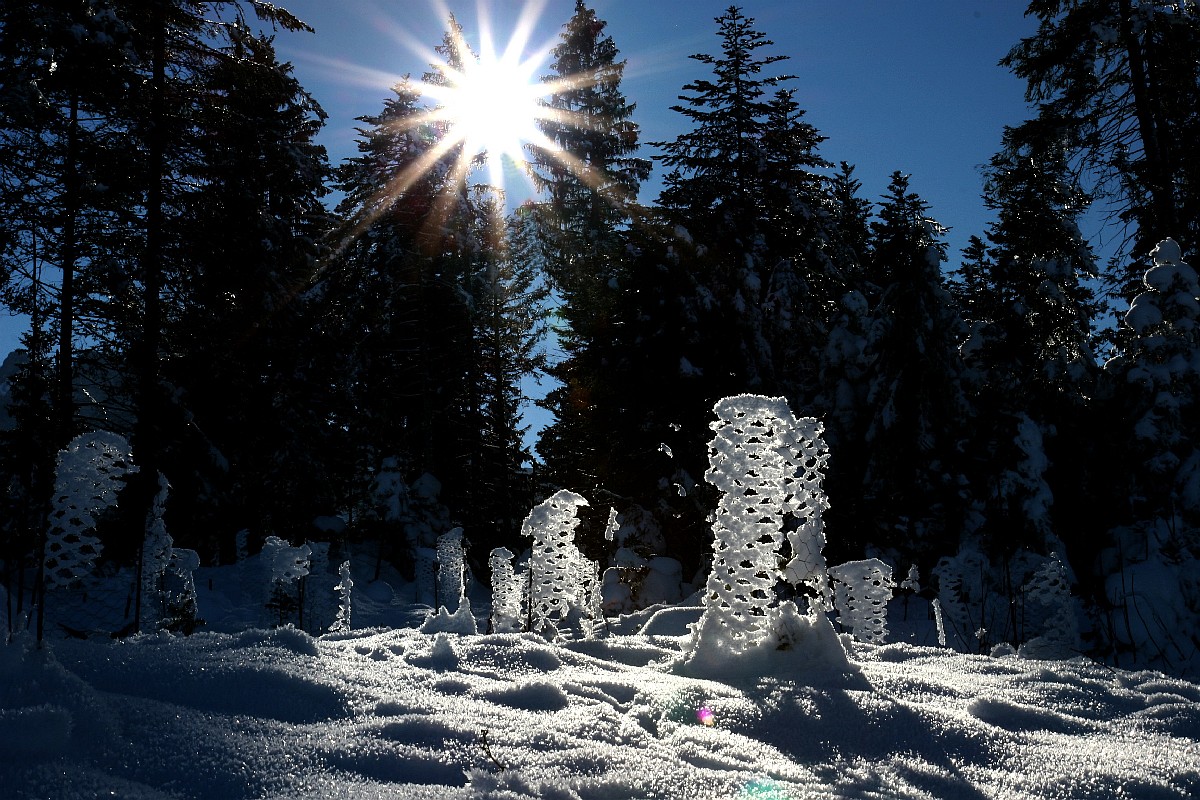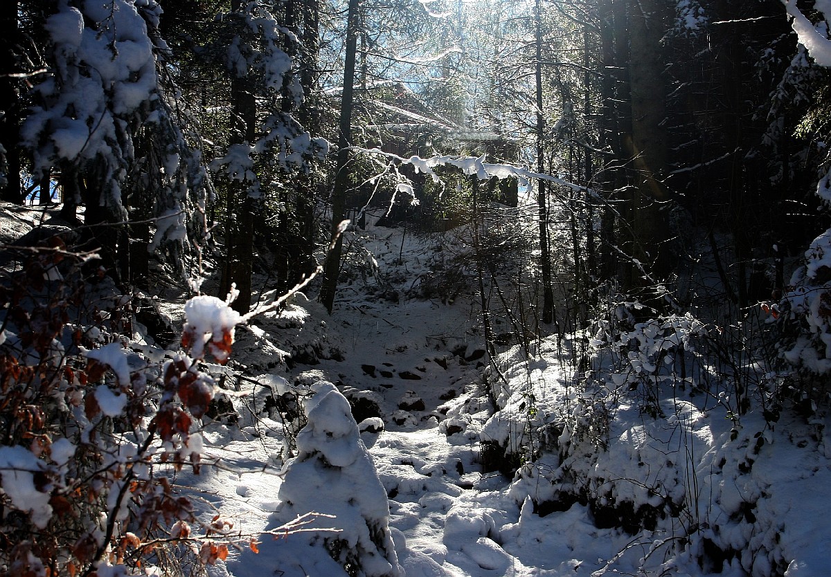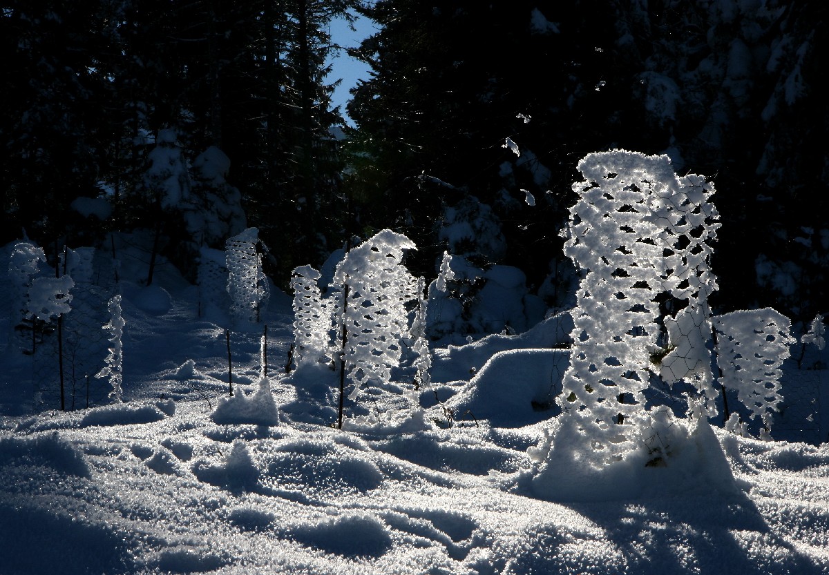 Angespornt durch die wunderschönen Fotos in diesem Thread (vielen Dank den Fotografen!) kam in mir die Sehnsucht nach Winter hoch. Da er dieses Jahr partout nicht länger bei uns im Tal verweilen will, ging ich am letzten Mittwoch hoch ins Pilatusgebiet um ihn zu suchen. Im Gebiet Krienseregg-Mühlemäss auf 1000 bis 1300 m.ü.M liegen je nach Lage zwar nur 15 bis 25 cm Schnee, was massiv unter dem langjährigen für diese Jahreszeit üblichen Schnitt liegt. In den Schattenlagen und Mulden wo sich die Kälte halten konnte, fand ich ihn trotzdem, den Winter, den ich so sehr mag. Frost, Rauhreif und Wind sind die Baumeister für das Winterwunderzauberland das ich dort vorfand. Es gibt ihn also doch noch, den Winter, auch in diesem Jahr, man muss ihn nur suchen gehen